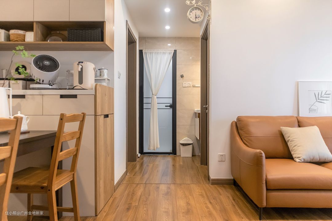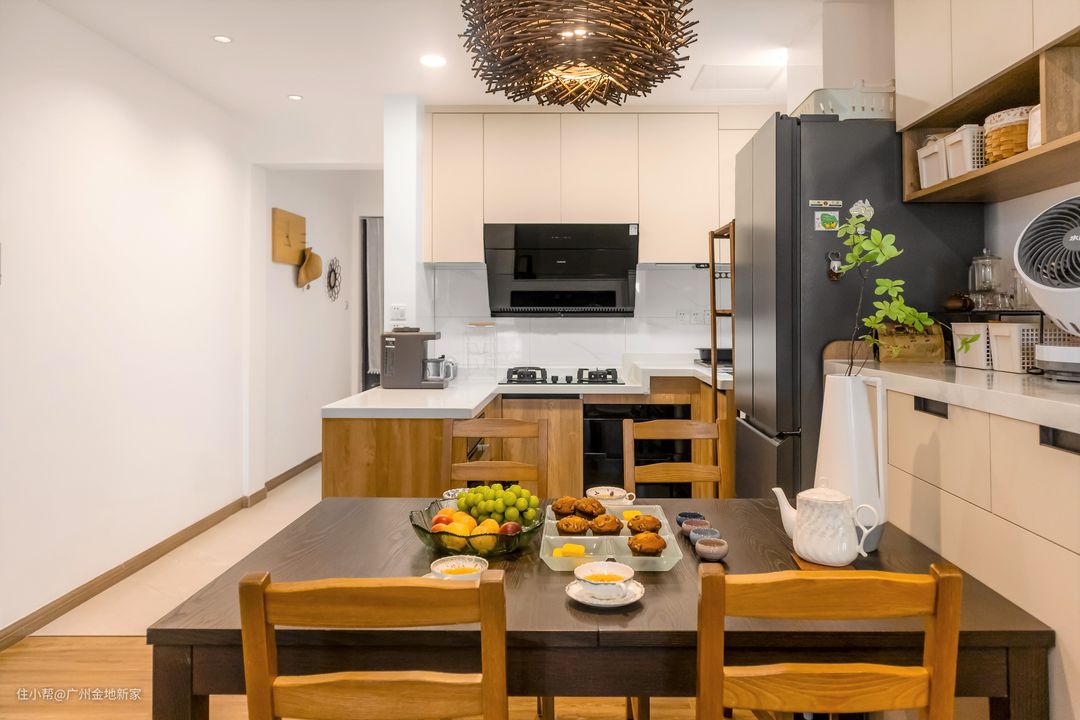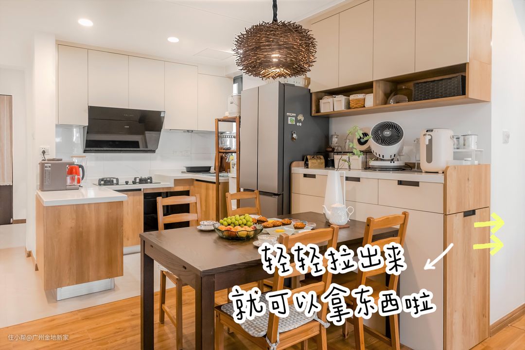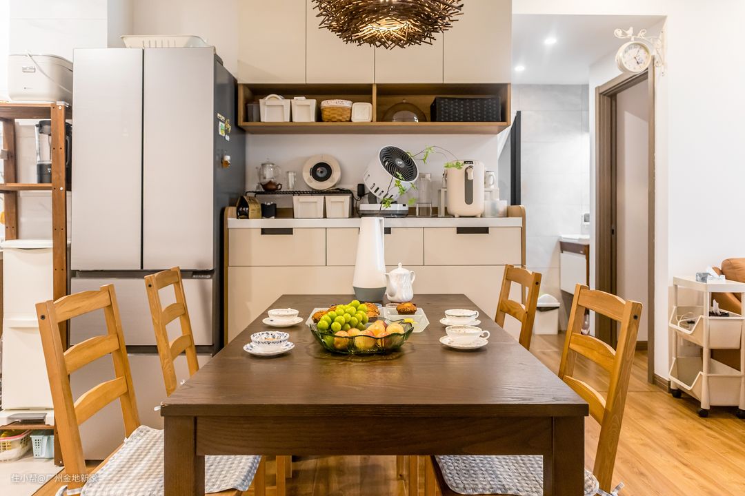 在餐边柜中隐藏了推拉柜体,这样可以在柜体旁放置餐桌座椅都不会有影响,需要拿柜子里的东西,只需要简单的推拉出来就可以拿到了。 柜体、冰箱、餐桌椅的尺寸都是经过精确的测量,整体搭配视觉上紧凑中带有和谐舒适。餐厨空间没有明确的隔断区域,餐厨一体化让整个家更具有流通性。