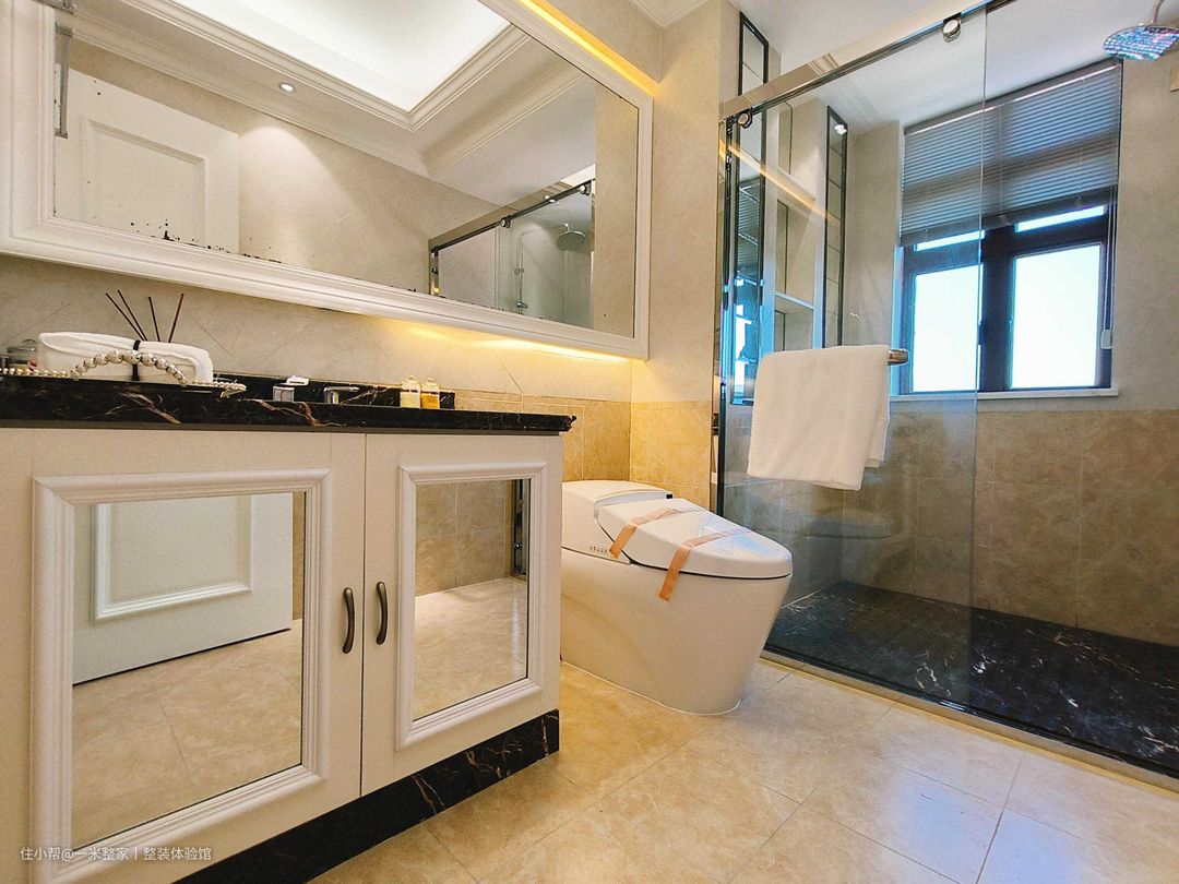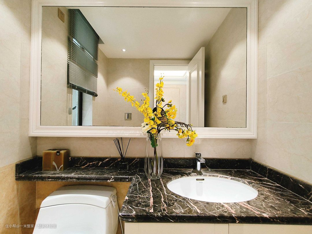 卫生间采用一字型布局,使用频率高的浴室柜放置在门侧,日常清洗更便捷。淋浴区墙面马赛克砖的美丽纹路,一如回到文艺复兴时期。 浴室镜四周援引灯带,柜板援引镜面,优化卫浴空间采光 。柜侧安装钢制挂钩,无惧浴室湿气,大幅提升生活便捷度。