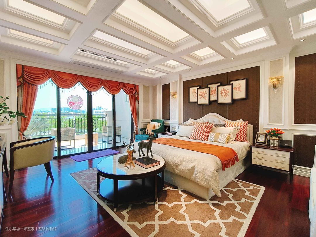 玻璃门揽进朗朗日光,温柔烘托睡眠空间,同时布置单人椅+沙发,缓解工作疲惫,赋予主卧更多休闲可能。 床头饰以褐色墙板、石膏线与米色墙布,将不同材质巧搭出华丽质感。金属元素点点缀入,带来安定空间的有力表达。 床尾一如床头援引褐色护墙板,饰画、绿植和斗柜的植入,带来多视觉焦点,平衡场域气质,成就满室复古味。 移步走入衣帽间,循序渐进的布局充满仪式感,柜中嵌入的灯带与顶面光源相映衬,为空间注入轻奢韵脚。 业主青睐不带门板的衣柜式样,设计师巧妙均衡挂衣区、抽屉、开放格的比例,兼顾各式鞋衣收纳,拿取一目了然。