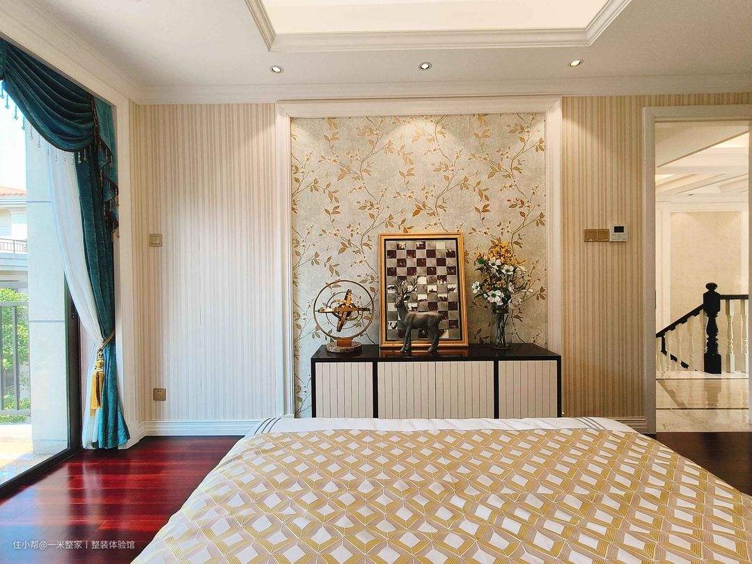 长辈房以素雅为题、米色为基描摹空间,床头包裹大地色系护墙板,几何式拼接形成直线交错,带来有趣视觉变换。 床侧陈列一组通顶衣柜,上竖柜下抽屉的布局设计,轻松安置四季衣物,白色面板捕捉筒灯柔光,开启块体与光影的对话。 墨绿窗帘与猪肝红地板,大胆撞色带来强烈中古感,花鸟壁布的引入,加上饰品错落铺排,串联起欧式丰富内涵。