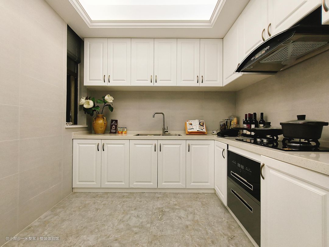 厨房呈L型布局,洗菜、备菜、烹饪三区有序划分排列,同步纳入冰箱 ,优化屋主烹饪场景,让生活更从容。 纯白橱柜中和暗厨无采光的空间压迫,回字型面板与复古金属拉手,以经典设计返现奢华有致的欧式生活。 台面四周均设有挡水条,有效阻隔台面积水,防止渗入墙地缝隙, 减少卫生死角。