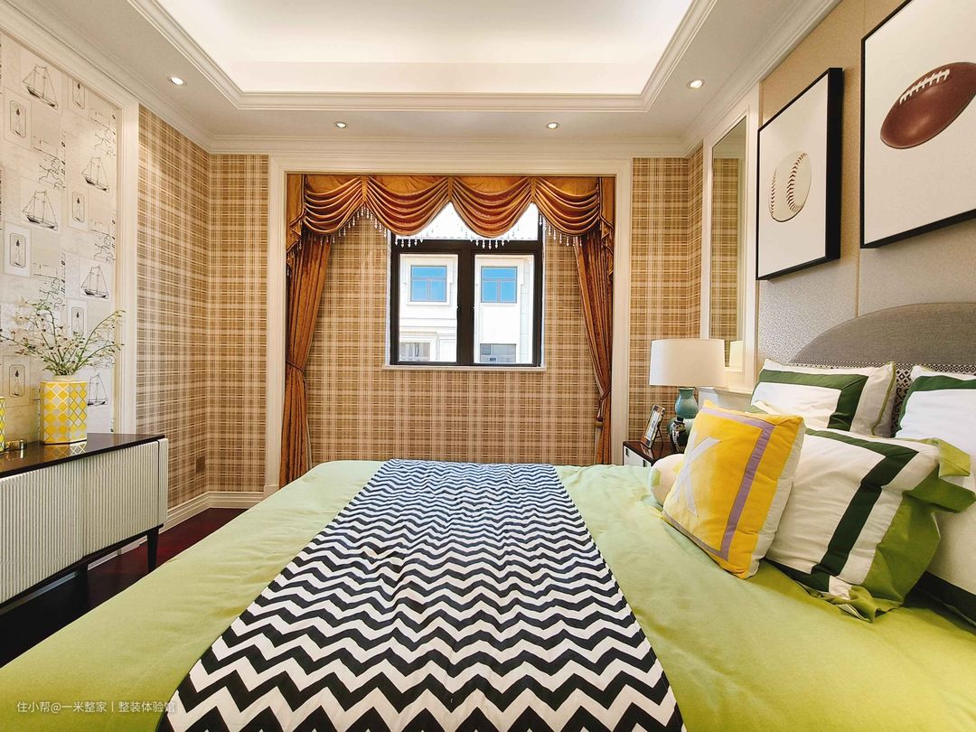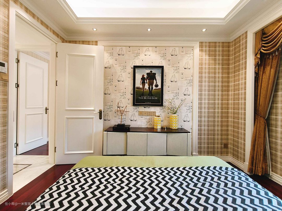格纹壁布为次卧拉引欧式意涵,窗幔柔和强烈日光,光与帘布相互映衬,由内向外诠释出光与结构的相织相融。 入门侧做嵌入式衣柜,两段式设计更显轻盈,中部留空收拢屋主配饰,在现在设计中注入人文情怀。 床尾使用帆船意象壁布,凝缩出北欧大航海时代,前方安置的矮柜,简约有型的线刻面板撑起空间气质。