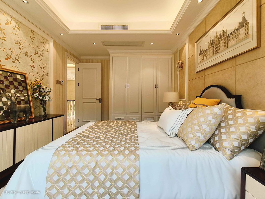 长辈房以素雅为题、米色为基描摹空间,床头包裹大地色系护墙板,几何式拼接形成直线交错,带来有趣视觉变换。 床侧陈列一组通顶衣柜,上竖柜下抽屉的布局设计,轻松安置四季衣物,白色面板捕捉筒灯柔光,开启块体与光影的对话。 墨绿窗帘与猪肝红地板,大胆撞色带来强烈中古感,花鸟壁布的引入,加上饰品错落铺排,串联起欧式丰富内涵。