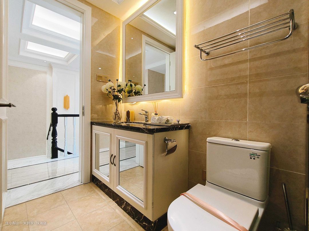 卫生间采用一字型布局,使用频率高的浴室柜放置在门侧,日常清洗更便捷。淋浴区墙面马赛克砖的美丽纹路,一如回到文艺复兴时期。 浴室镜四周援引灯带,柜板援引镜面,优化卫浴空间采光 。柜侧安装钢制挂钩,无惧浴室湿气,大幅提升生活便捷度。