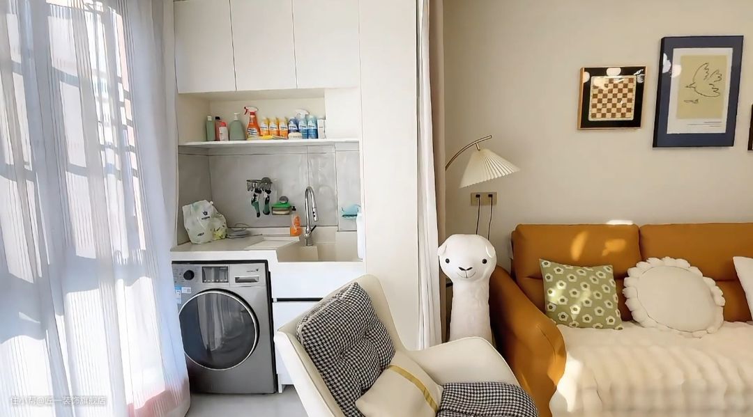 地面通铺800×800的浅灰色通体大理石瓷砖一直到阳台,这种瓷砖给人一种高级感,同时也能防滑耐磨,实用性很强。阳台一侧做洗衣机柜,另一侧可以作为休闲区放置全身镜,充分利用了空间。
