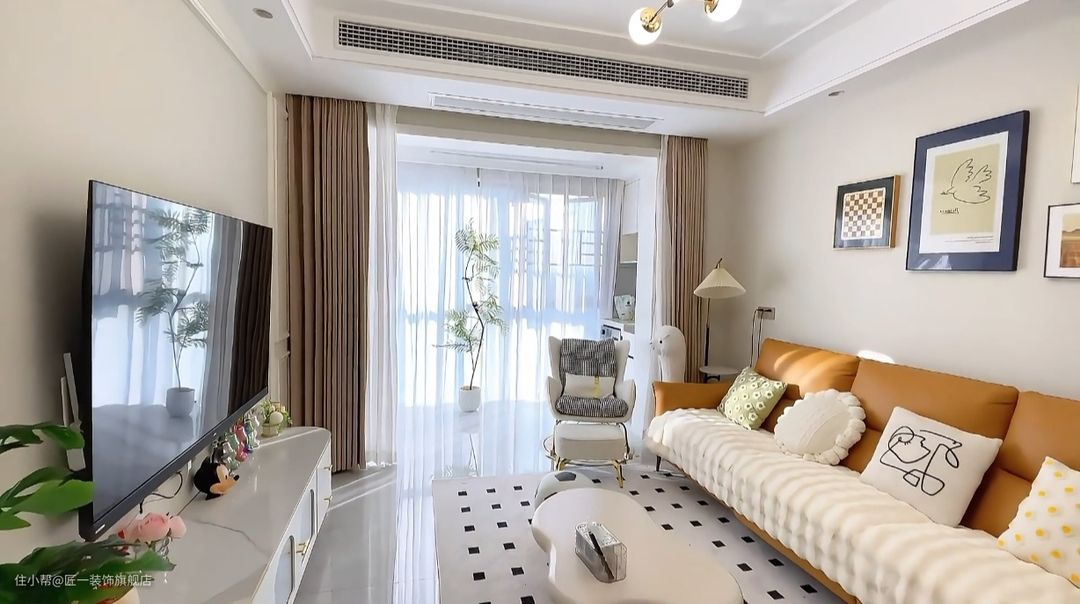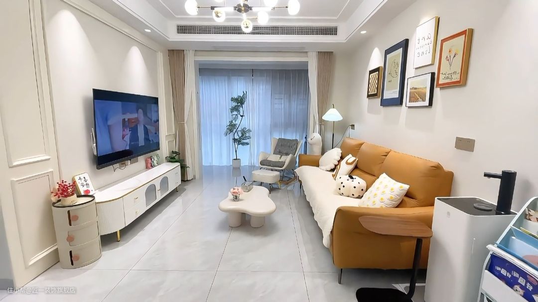 客厅墙面直接刷白色乳胶漆,搭配上pb线条和白色金属落地电视柜,营造出一种简约大气的氛围。橘黄色皮质沙发,为空间增添了一丝现代轻奢的质感。 顶面做回字型吊顶安装中央空调,这种设计既美观又实用,可以隐藏中央空调的管线,让空间看起来更加整洁。