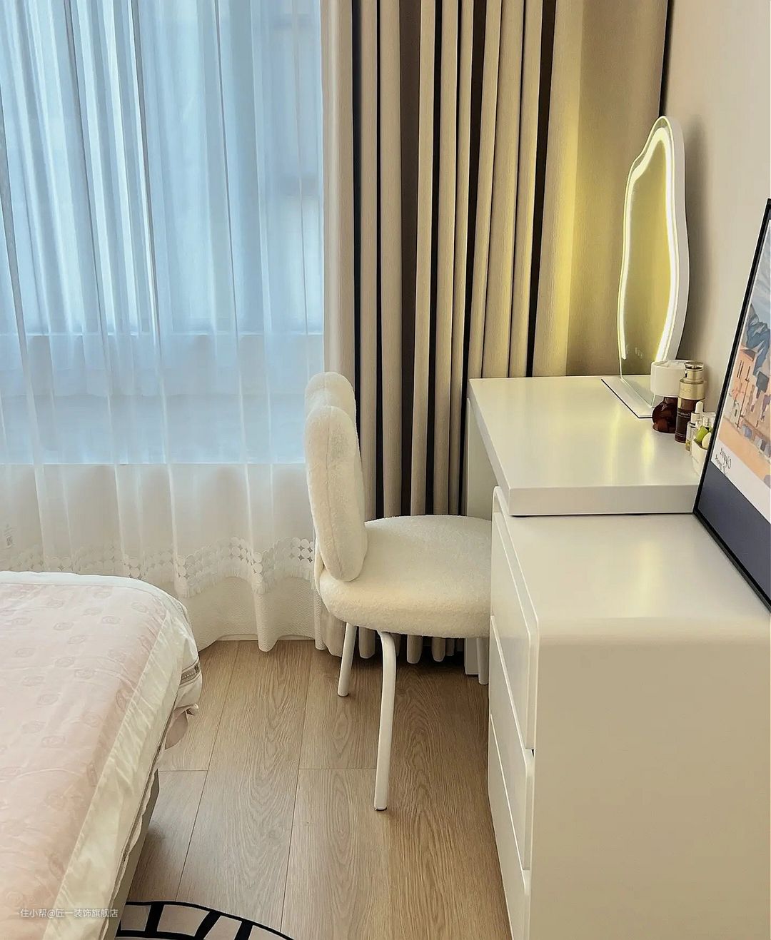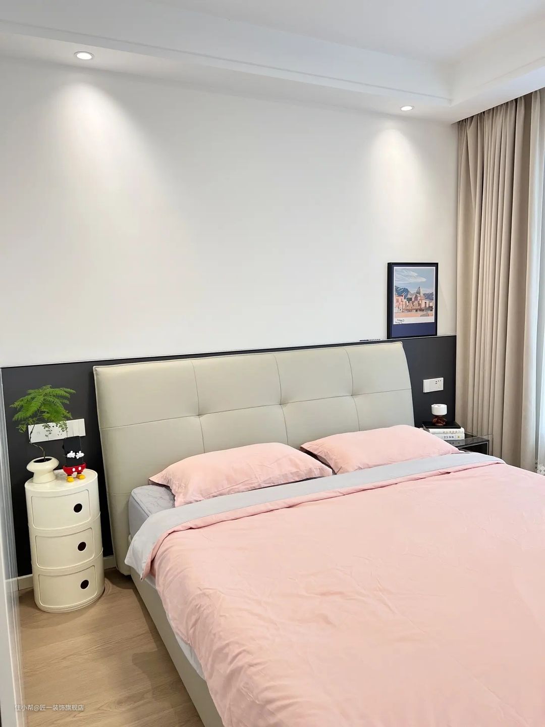 次卧室的地面铺原木色地板,墙面也是刷乳胶漆,营造出一种温馨自然的氛围。白色柜门搭配上黑色柜体和奶咖色窗帘,简洁而时尚。
