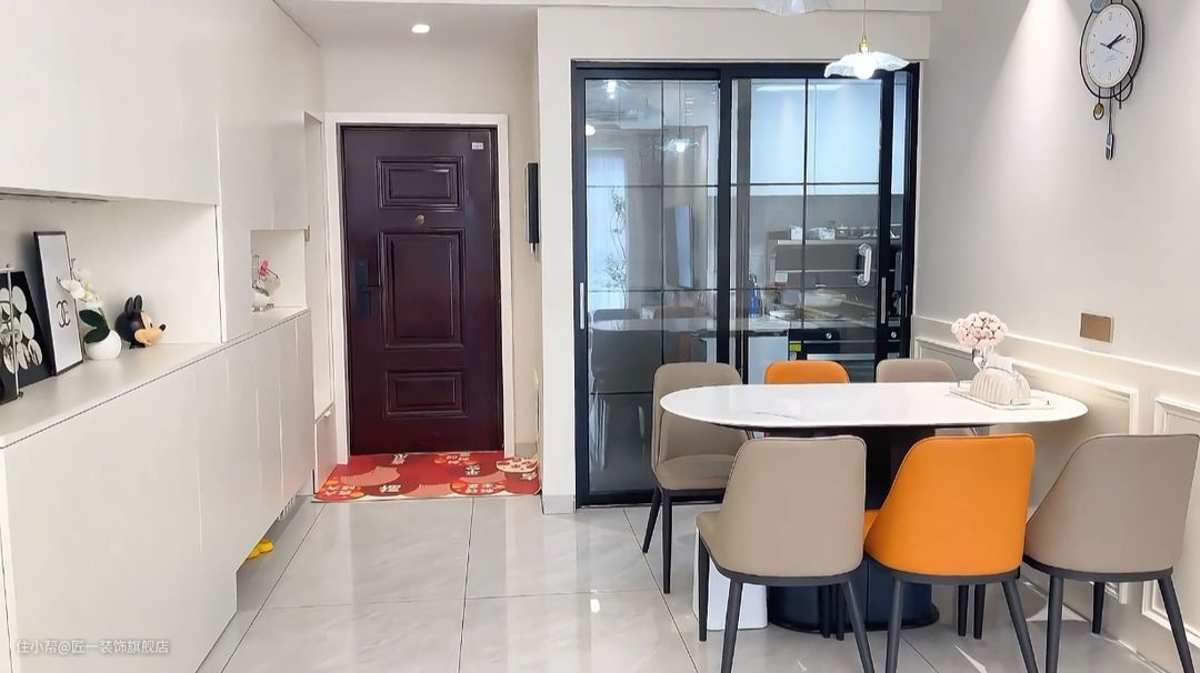 进门靠一侧做鞋柜连接餐边柜一体,白色的柜门和柜体给人一种简洁明亮的感觉,鞋柜底部留空内嵌换鞋凳,方便实用。 另一侧就是厨房,做双联动地轨推拉门,黑色极窄边框,既美观又实用。白色大理石餐桌加上灰色皮质餐椅。