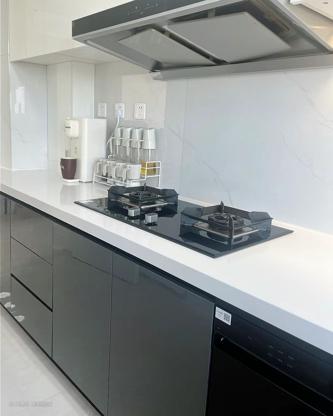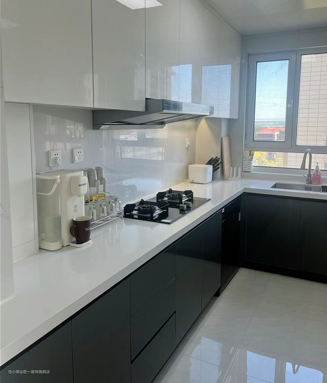 厨房的橱柜采用了L型的布局,黑色地柜搭配上白色吊柜,给人一种简洁明快的感觉。柜子做到顶收纳更加充足,方便使用。