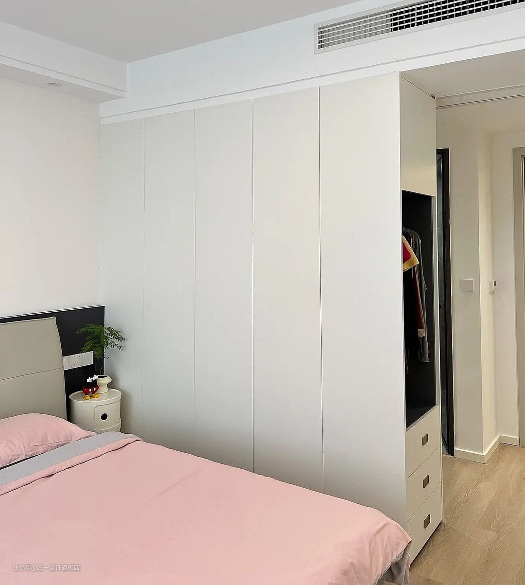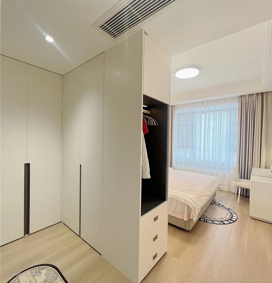 主卧室做了个L型的衣帽间,充分利用了空间,床尾放置梳妆台,方便女性用户使用。中央空调的顶面出风口设计,让空间看起来更加整洁。