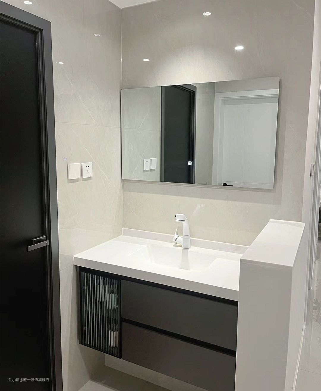 卫生间做干湿分离岩板陶瓷一体台下盆,浴室镜柜可以满足收纳需求。墙面和地面都铺瓷砖,简洁易清洁,同时也能营造出一种现代感。