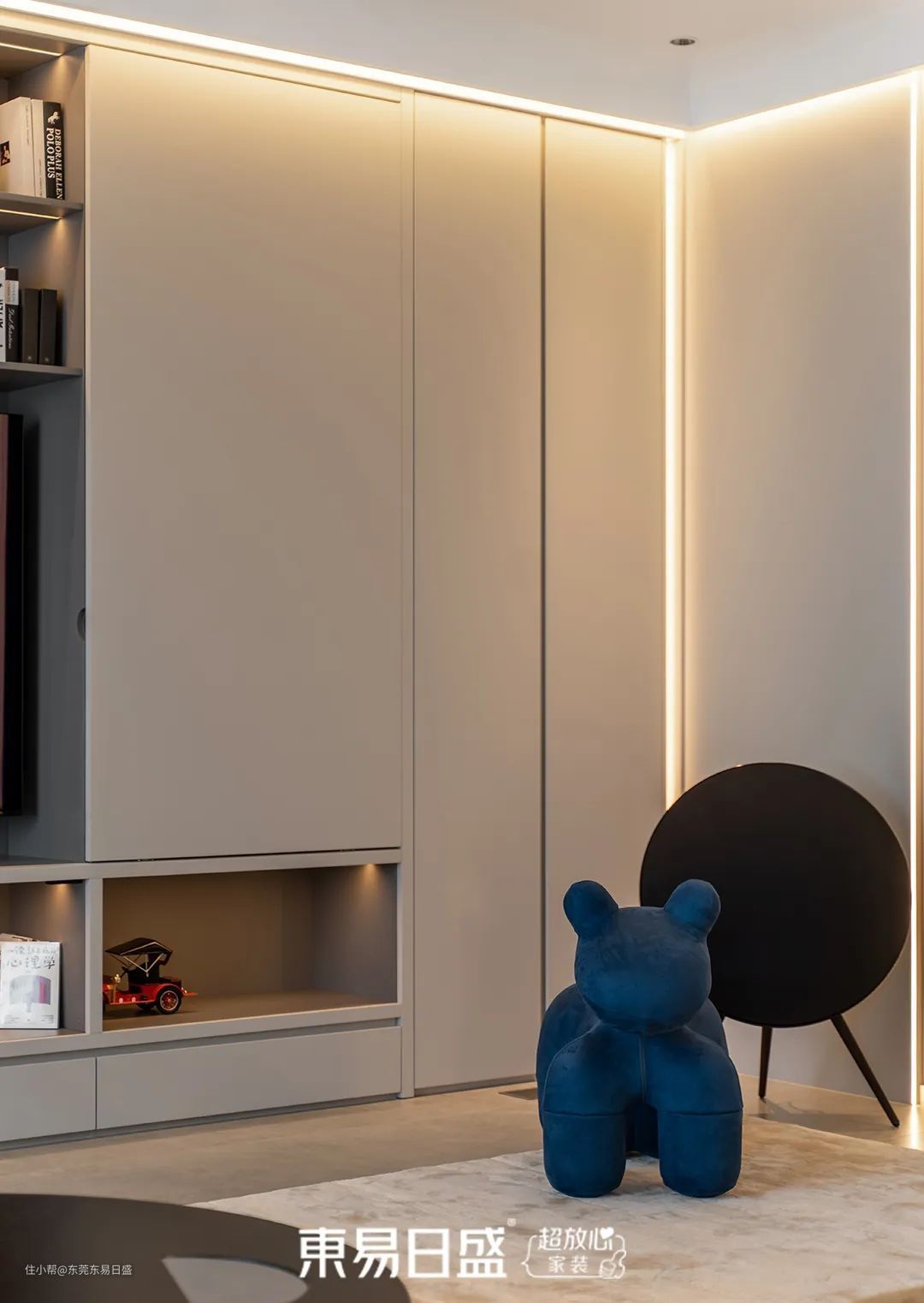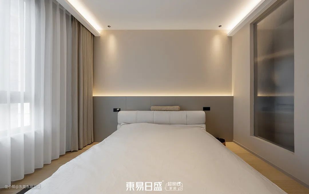 次卧作为客房,设计简约而克制。半墙拼色搭配灯带装饰,营造出干净高级的氛围。卫生间则通过玻璃向室内借光,提升了空间的舒适度。