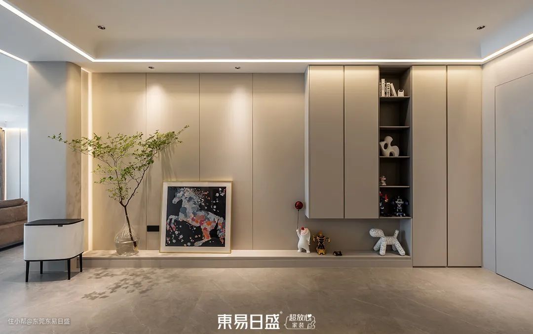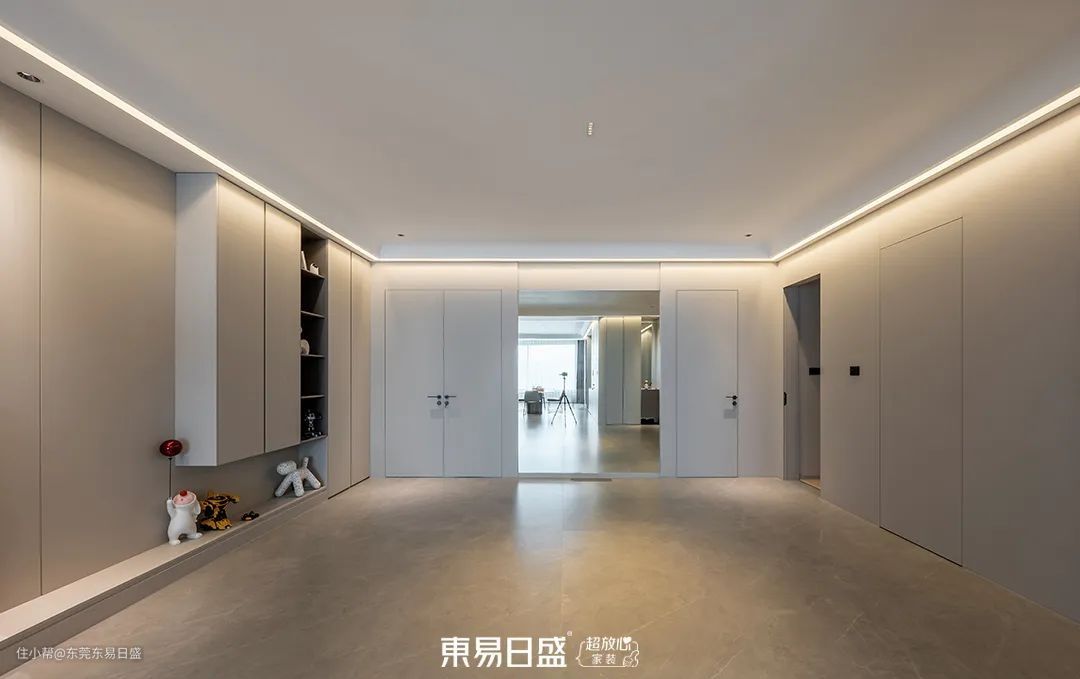 宽敞的门厅设计,去除了多余的墙体,使得空间更加开阔。摩登、时尚、简约的设计风格,与地面的飘逸石纹相呼应,为整个家定下了基调。