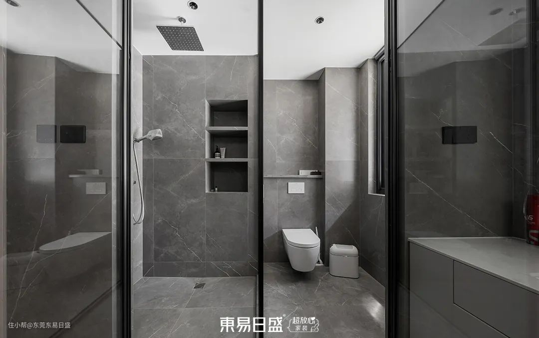 卫生间因为无采光的原因,设计师利用玻璃向室内借光,透光不透影的设计让空间舒适度大大提升。