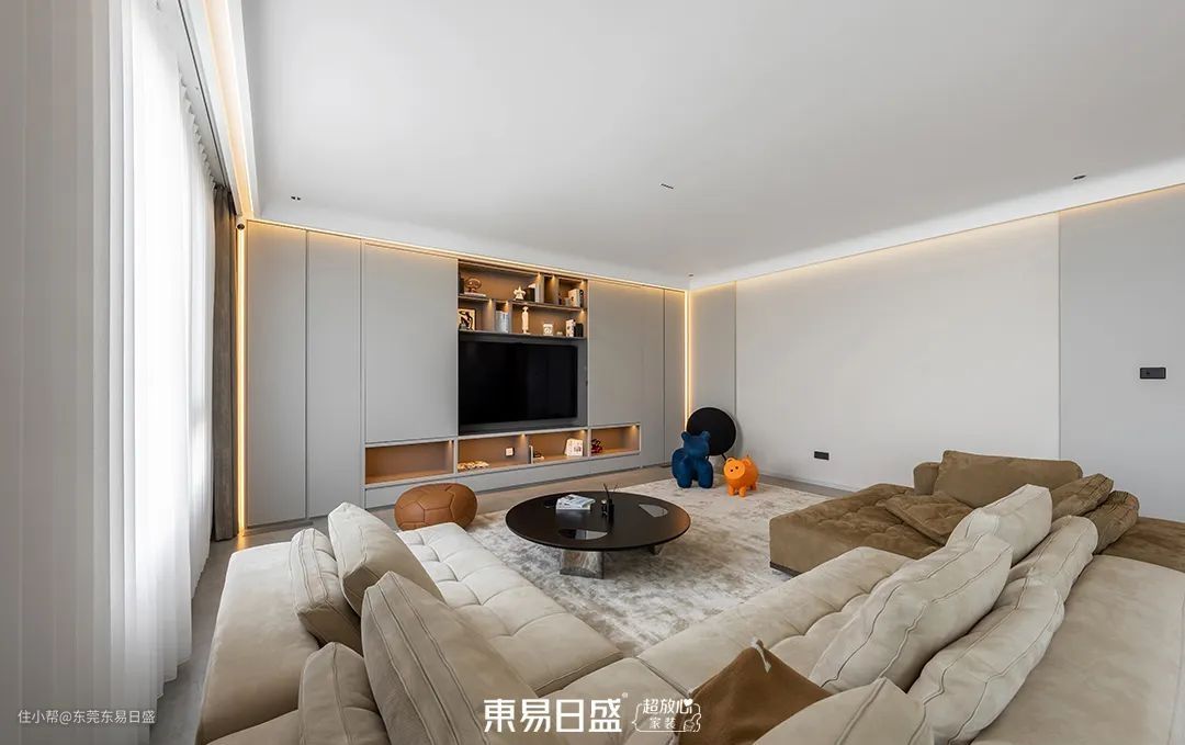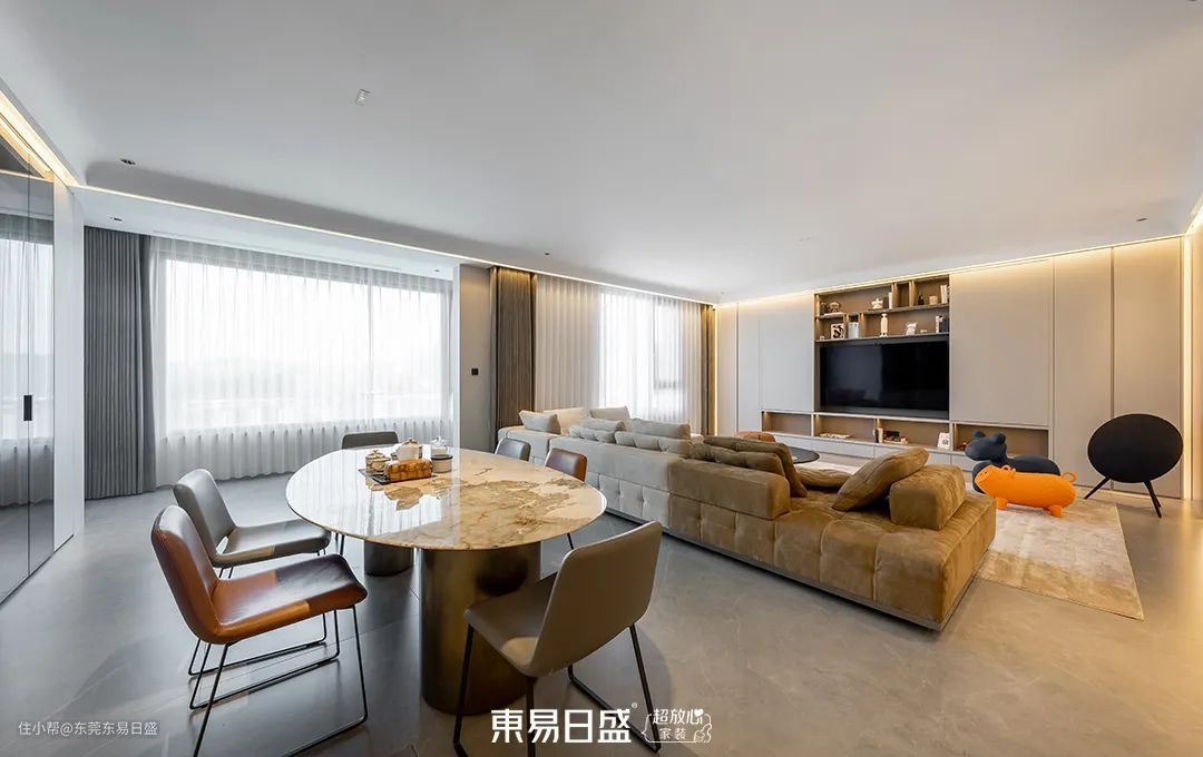 客厅与餐厅的无缝衔接,增强了空间的开阔感。简洁的直线条电视背景墙与方正的沙发组合,营造出与家人、朋友共聚的温馨氛围。横厅电视墙的定制收纳设计,既弱化了电视的笨重感,又提升了收纳功能。