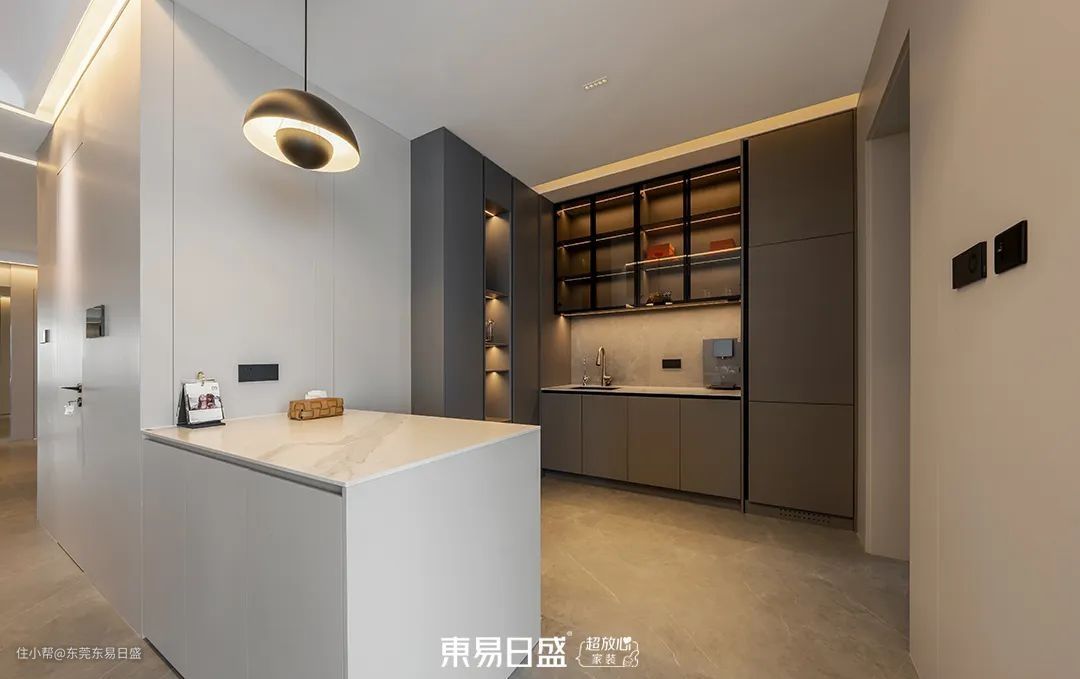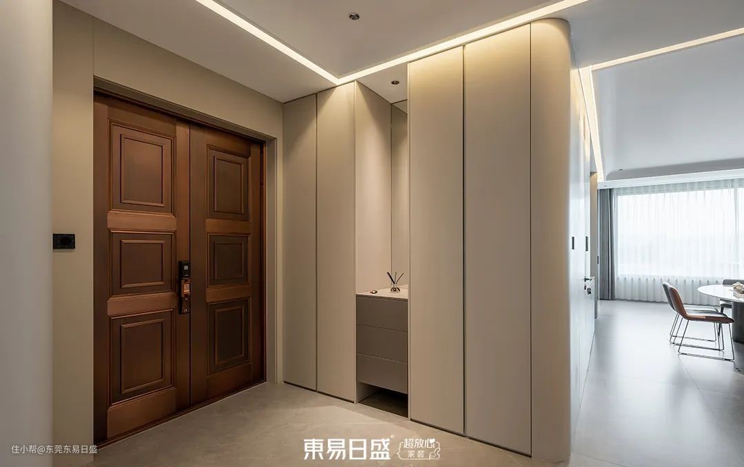 宽敞的门厅设计,去除了多余的墙体,使得空间更加开阔。摩登、时尚、简约的设计风格,与地面的飘逸石纹相呼应,为整个家定下了基调。