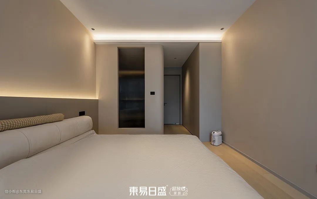 次卧作为客房,设计简约而克制。半墙拼色搭配灯带装饰,营造出干净高级的氛围。卫生间则通过玻璃向室内借光,提升了空间的舒适度。