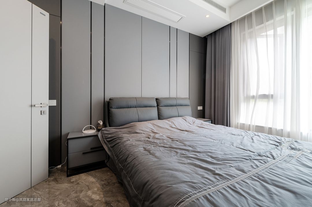 卧室的面积中规中矩,跟常见的卧室不同,这里选用了大量的深色调打造空间,却不会觉得沉闷。因为黑灰色叠加过渡,反而增加了空间的层次感。 软装色彩跟硬装都是呼应的,灰色的皮质床和同色的窗帘,都是高端简约的色彩,也符合这个家高端奢华的气质。 卧室地面也是通铺的灰色地砖,整屋色彩契合,更能突出现代轻奢风的高级感,商务范儿十足。