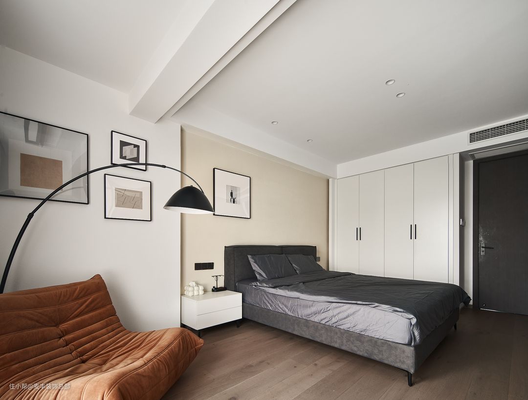卧室空间更需要营造入睡前的氛围感,采用奶黄色墙面,搭配懒人沙发、温暖的木地板,营造出舒适放松的睡眠氛围。