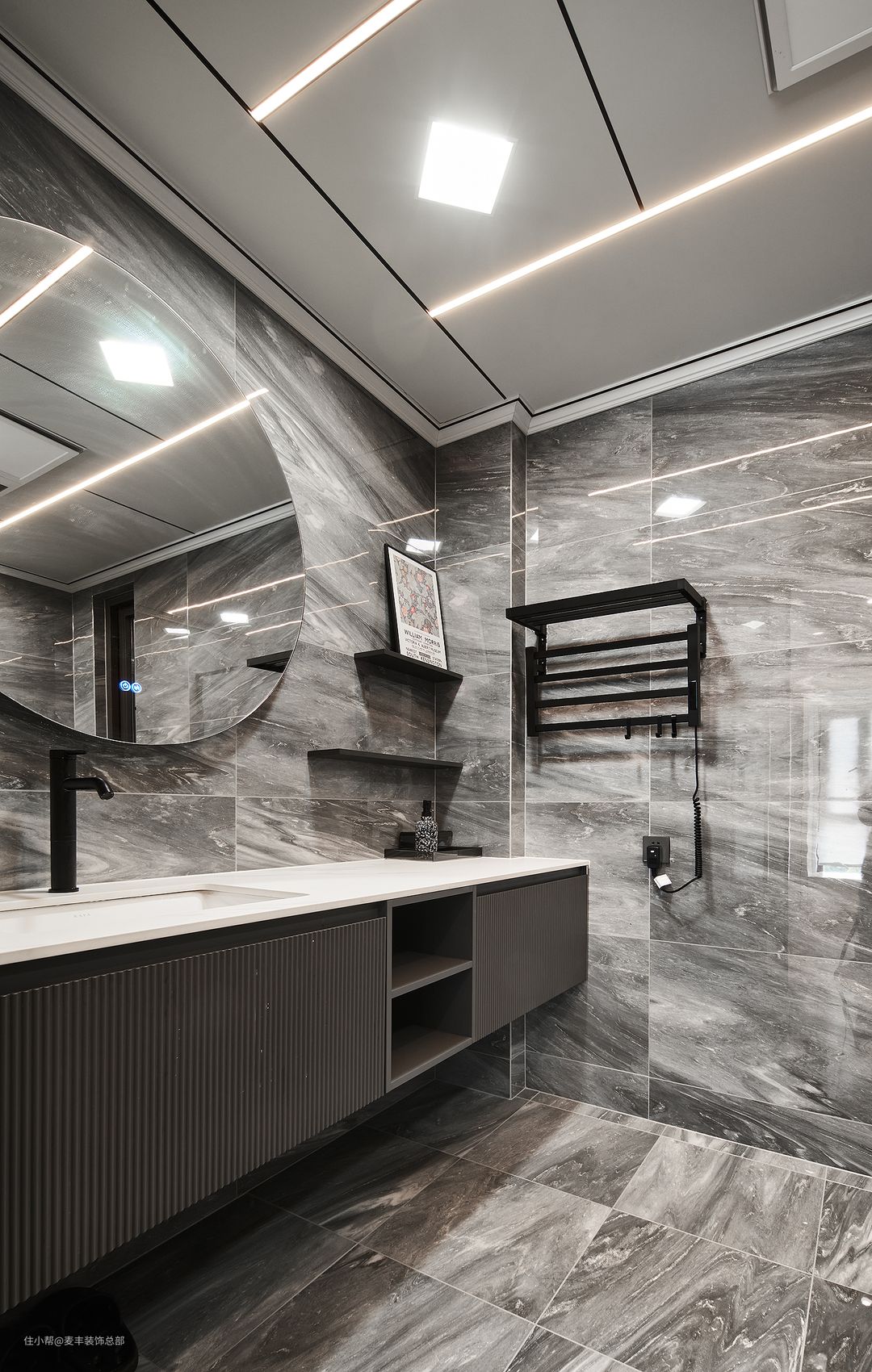 卫生间采用灰色基调,线性灯带显示光影质感,双台盆一体,妥帖考虑到家庭成员的洗漱需求,提升生活品质。
