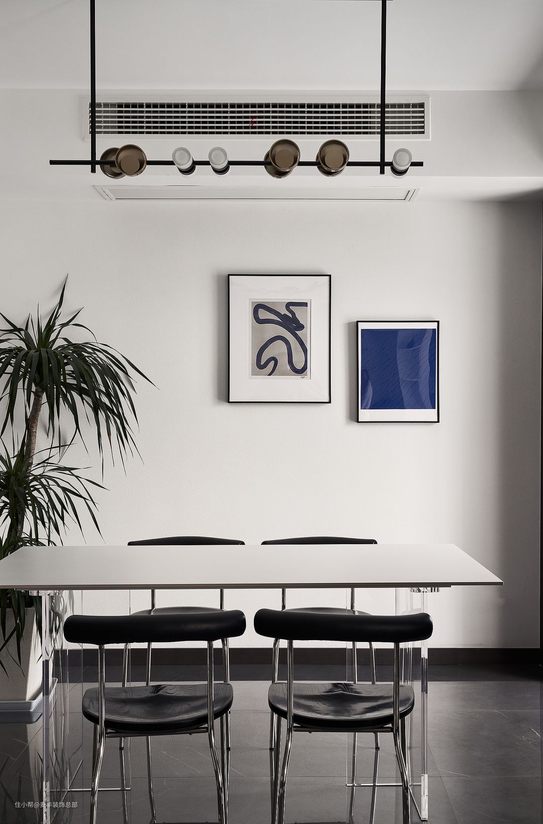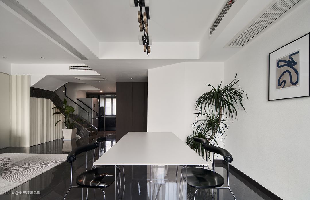 简约大气的白色岩板餐桌,深色皮质餐椅,搭配简约一字吊灯,以最简单的基调,营造空而美的用餐氛围。