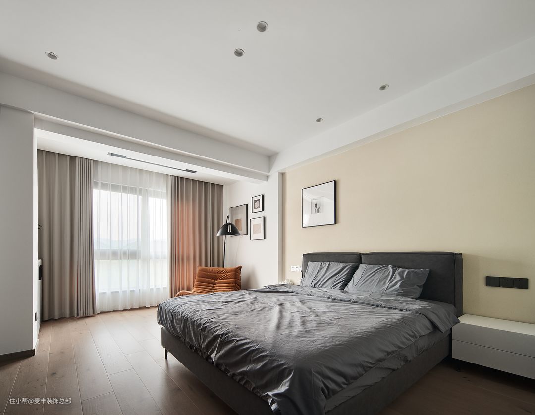 卧室空间更需要营造入睡前的氛围感,采用奶黄色墙面,搭配懒人沙发、温暖的木地板,营造出舒适放松的睡眠氛围。