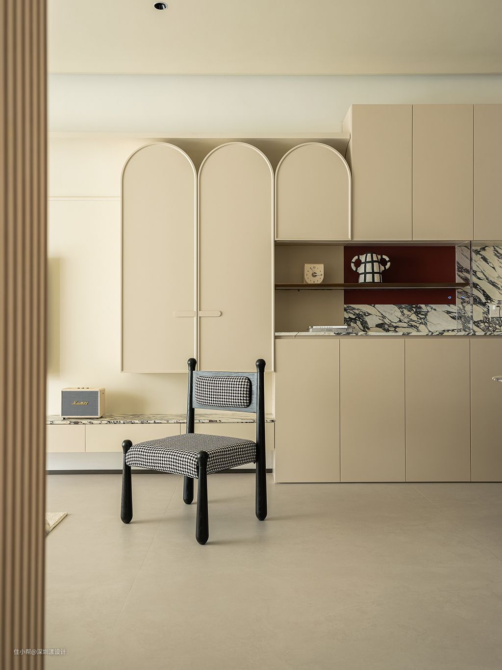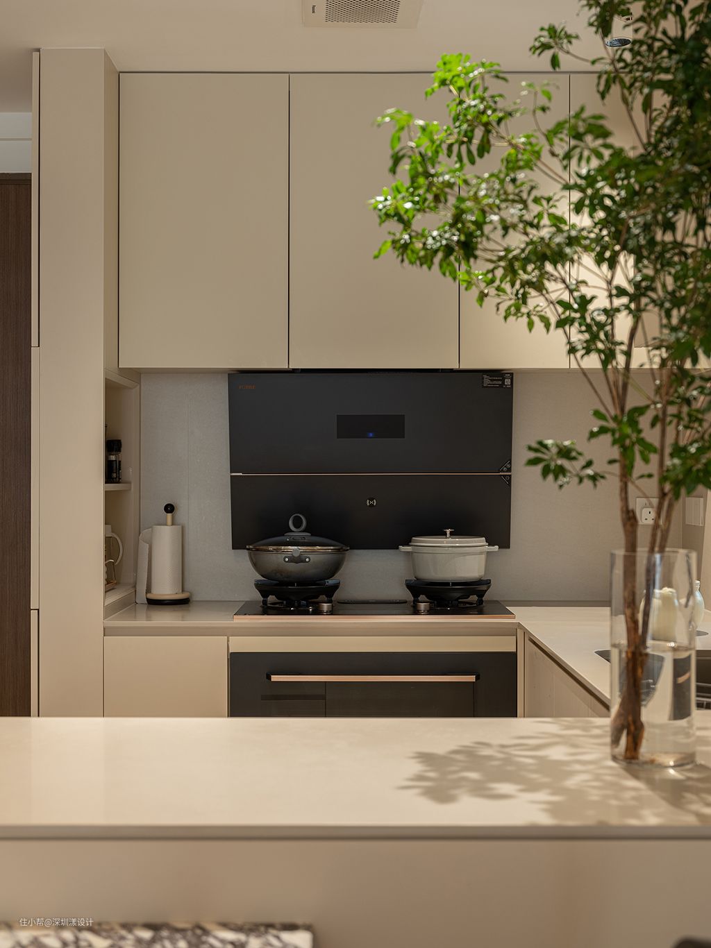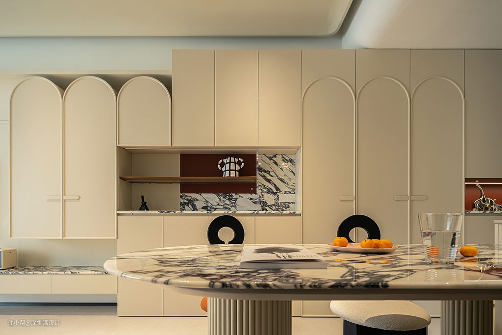 开放式厨房的奶油色的餐边柜,与整个空间的装修风格相得益彰。厨房锅具、电器整洁摆放,还可以放置烤面包机、咖啡机等小型厨房电器,给日常生活带来更多场景体验。