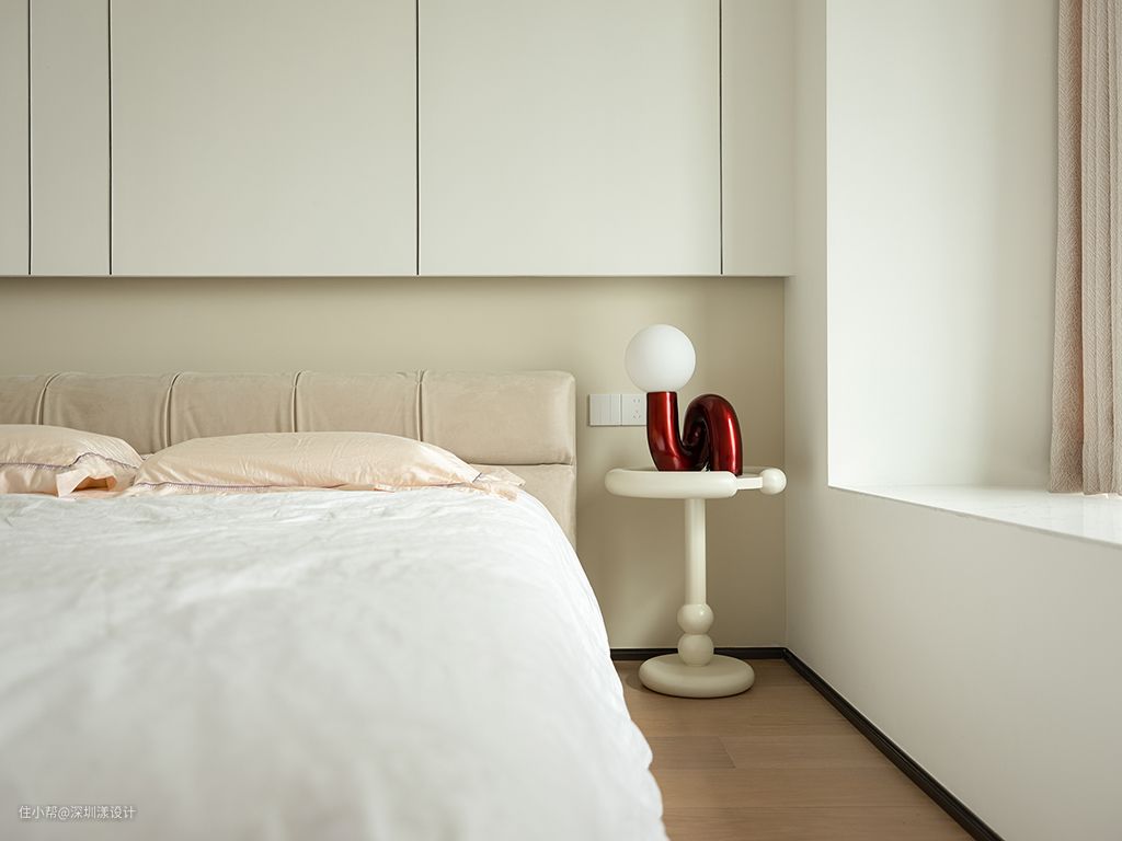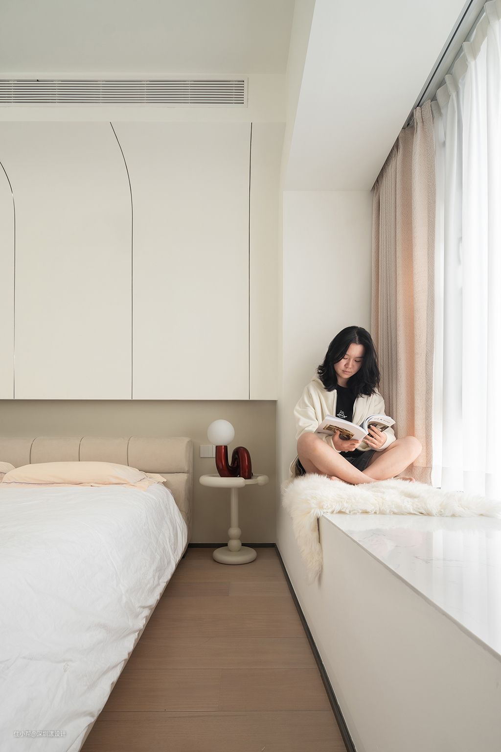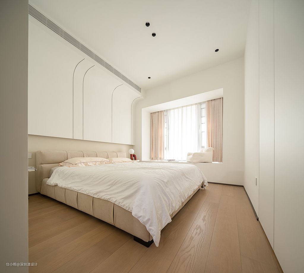 主卧尽可能减少不必要的装饰,色调延续了客餐厅的色调,营造空间的松弛感。床头背景墙利用弧形线条修饰空间轮廓,并延续到顶面做空调出风口,柔化了原本棱角自带的犀利,也让整体空间更加美观。