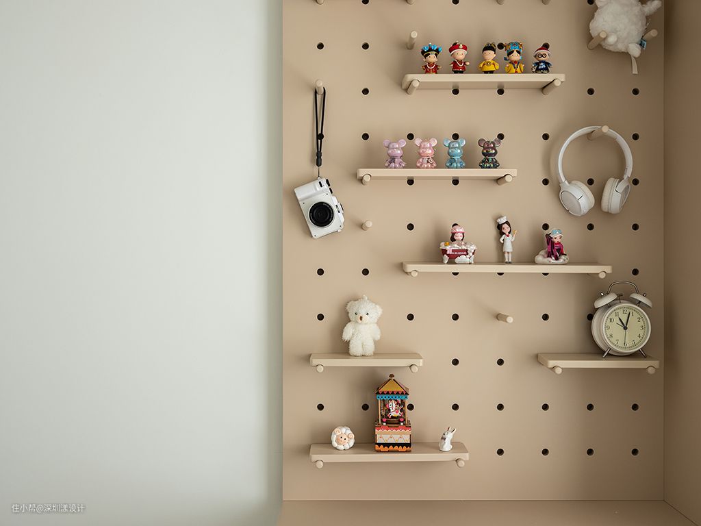 洞洞板背景墙充满童趣,可以放置相机、耳机、帽子、有纪念意义的照片等自己喜欢的物品,仿佛内心的“展示板”,充满无限温情~