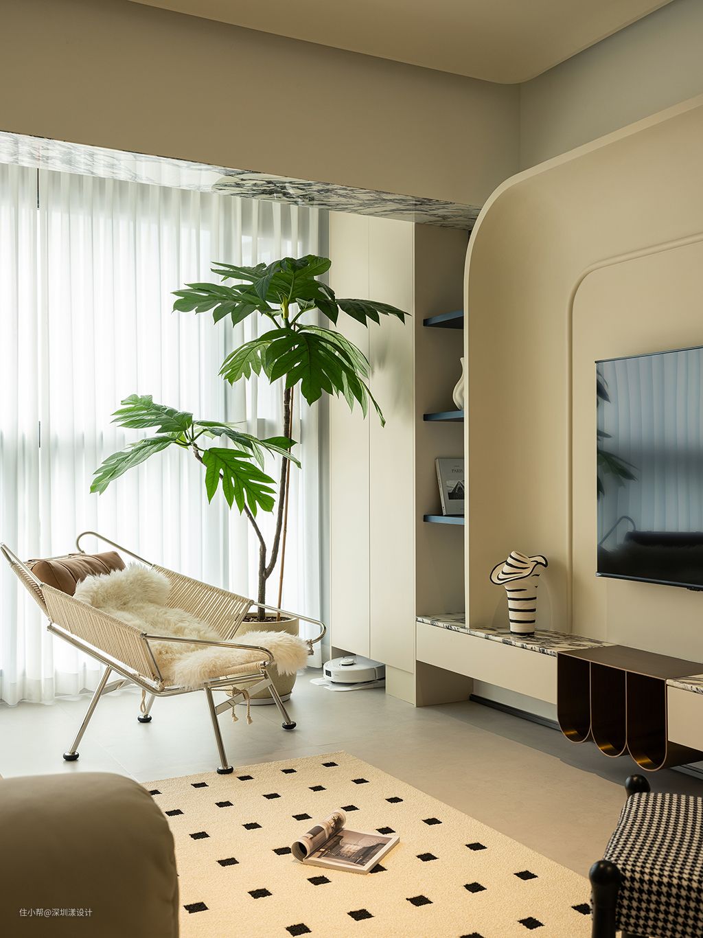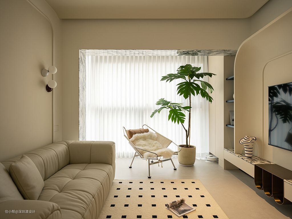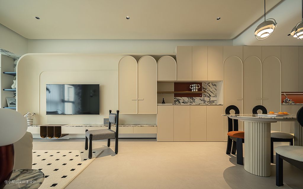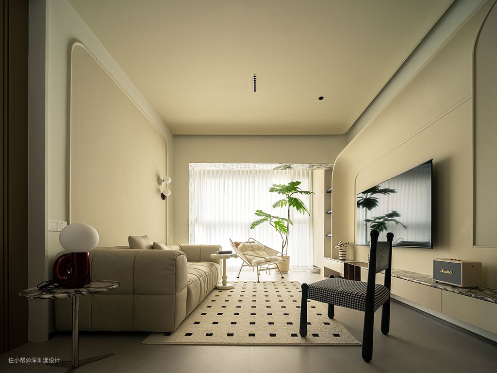 全屋通刷可可蛋奶乳胶漆,扑面而来的是和煦温柔的暖意。电视背景墙整体用烤漆板打底,四周弧形设计仿佛一个柔滑的碗形,自然地与梁位和开放格衔接,通透和柔和的氛围在客厅间缓缓游走。电视柜底部镂空隐藏灯带,灯光开启灯带反射到地面。光芒漫射将地面打亮,让整体空间更显轻盈与开阔。