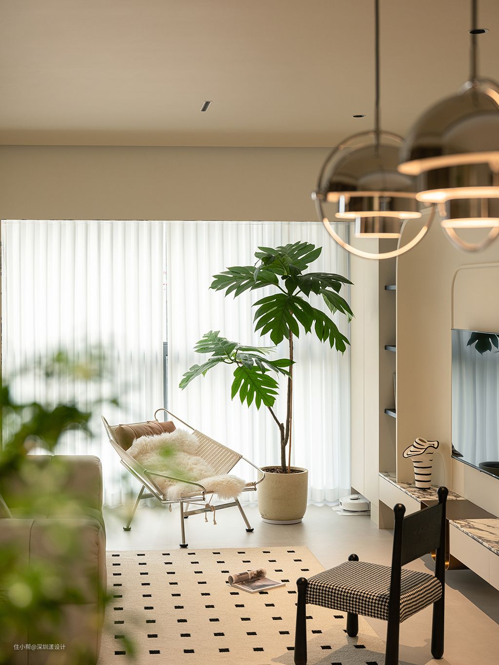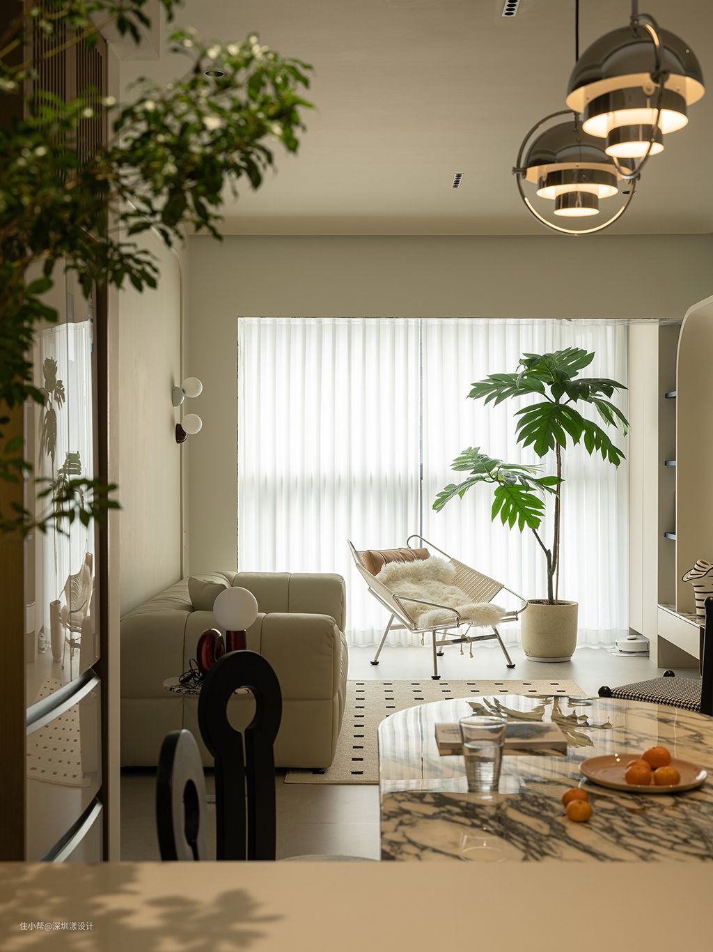 作为生活的核心区域,客厅以可可蛋奶营造的暖调为空间主色调,搭配同色系的地砖呈现出了奶油包裹般的温暖与治愈。光影悄然注入,点缀着屋内的细节角落。柔软沙发、大理石茶几、波点地毯、绿植包含丰富质感的软装家居传递着安宁、干净的居住氛围,为空间带来深浅有度的层次感,丰富了居家生活的可能性。