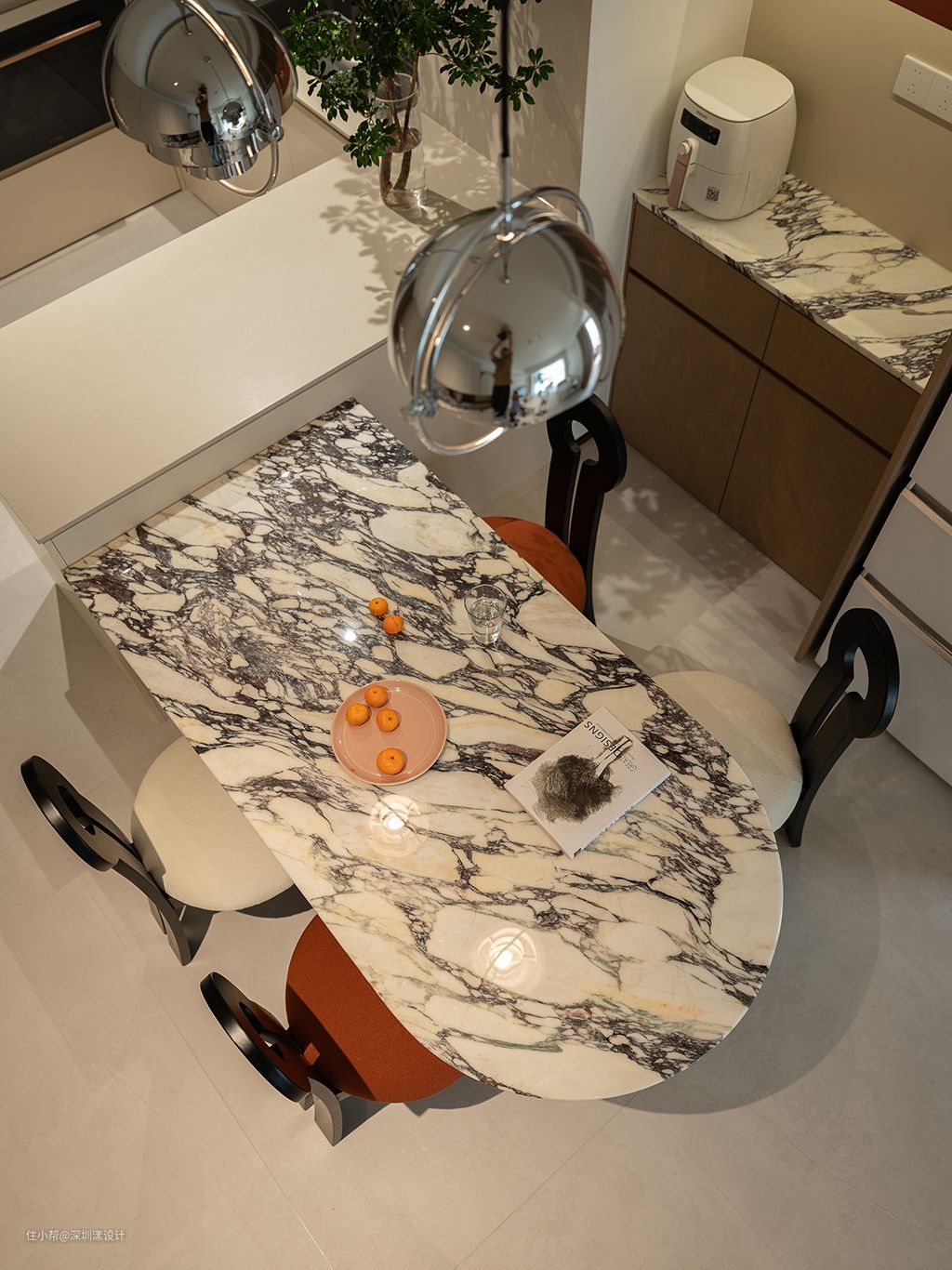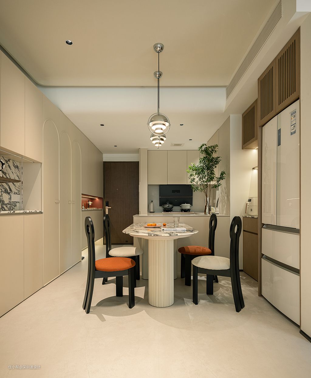餐厅的焦点聚于餐桌与吊灯上,圆形的大理石餐桌流淌自然高级的质感,弧形造型圆柱桌脚及整体设计和谐呼应。吊灯更是精心搭配,半圆弧+金属材质设计极具艺术感,既能呼应客厅壁灯呈现整体性,又为用餐环境增添了有层次的温馨氛围。