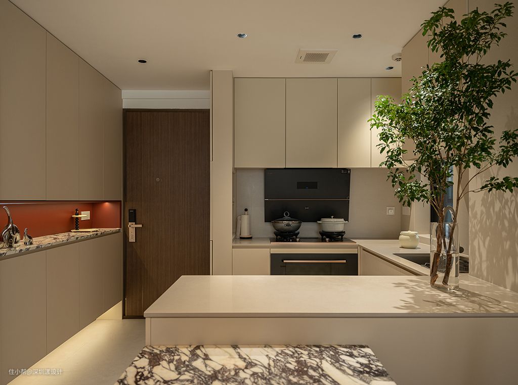 厨房色调与整体空间保持一致,同色系橱柜地板,使空间更加明亮柔和。