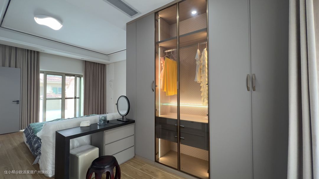 ① 主卧进门是一个L型的小衣帽间,满墙顶天衣柜,中间是窄边玻璃门柜,搭配暖灯,氛围感和颜值满满 ② 衣柜拐角是个梳妆台,下方有几个抽屉柜,收纳瓶瓶罐罐等化妆品,大大增强收纳能力。整个空间动线十分流畅,卧室空间较大,想要小衣帽间的各位可以参考
