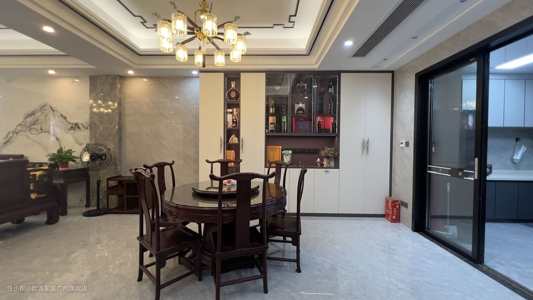 ① 靠墙定制顶天餐边柜,中间设置镂空,安装电动导轨,方便小型电器的使用 ② 设置多个玻璃门展示柜,摆放美酒、器具等,左右的封闭柜能收纳大型物品,保证空间和柜子台面的整洁 ③ 餐厅中间摆放一张红木圆形餐桌,满足日常用餐需求,与整个空间的氛围也十分统一