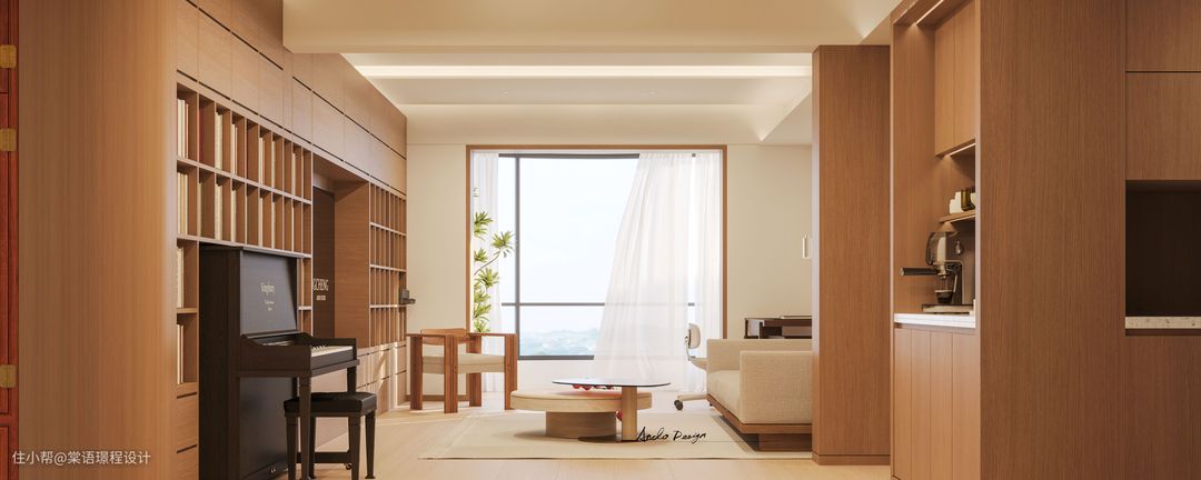 客厅空间,简洁大方为主,电视墙做开放格收纳柜,方便拿取。通顶设计,让空间看起来美观大气。 沙发墙采用浅色木饰面满贴,搭配简易的布艺沙发与木质家具,整洁又高档,搭配白色窗帘,地面铺上白色地毯,整个空间都变得暖暖的。