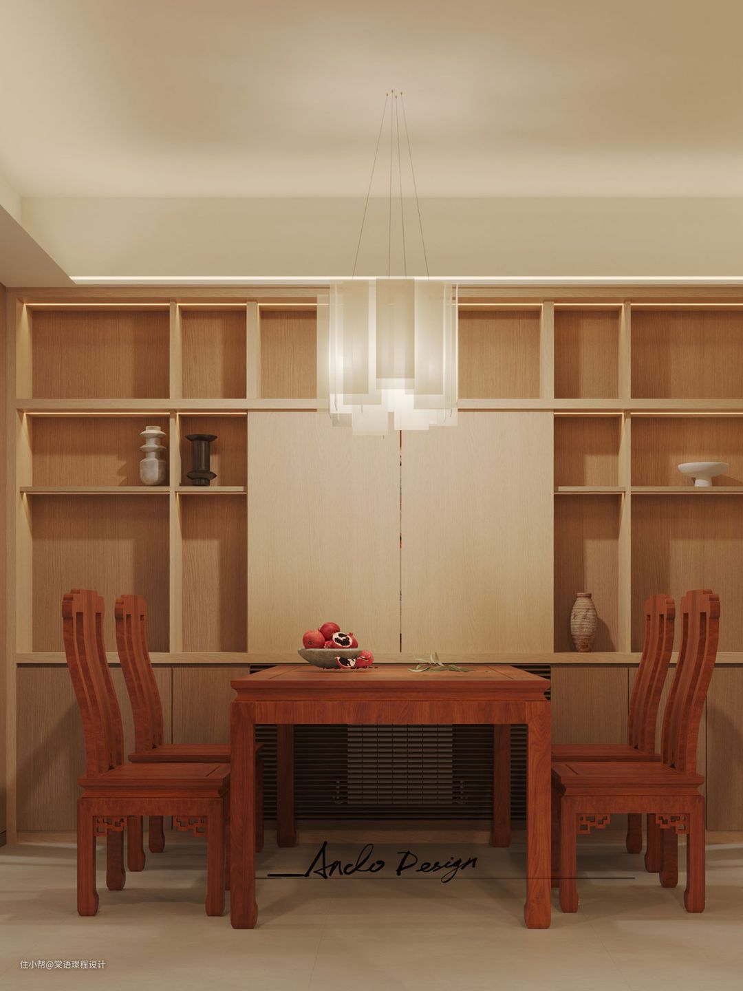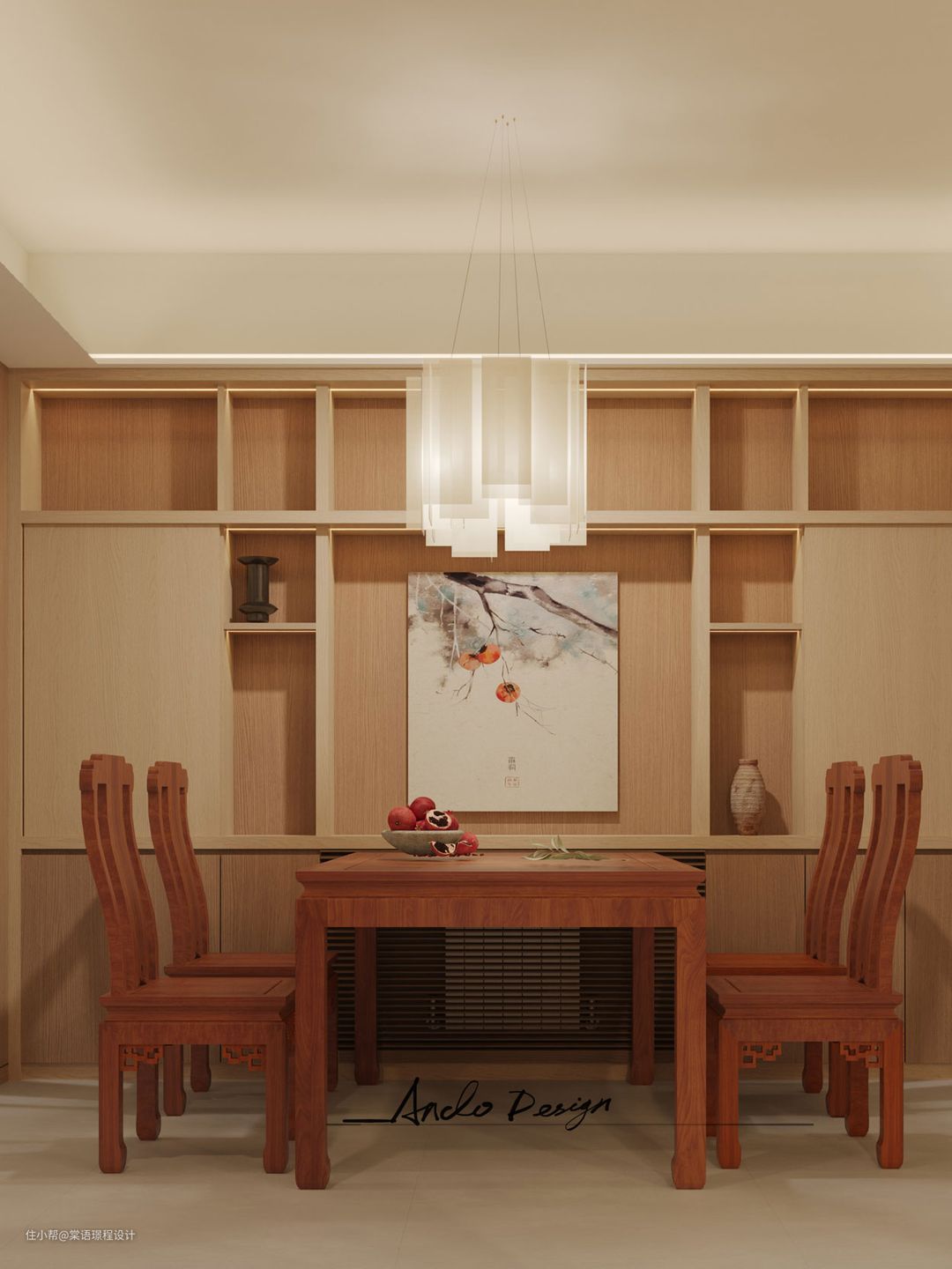 餐厅的设计与客厅是统一的,不仅色彩,还有通顶的开放式收纳格,天花板造型,每一个细节都透露出了整个空间的统一性。推拉设计的柜门,让收纳变得有趣起来,实木餐桌上的果盘布置,与空间相呼应,也让空间显得端庄而清新自然。为了保证餐厅的整洁,餐边柜是必不可少的收纳柜,顶天立地的设计,收纳实现最大化