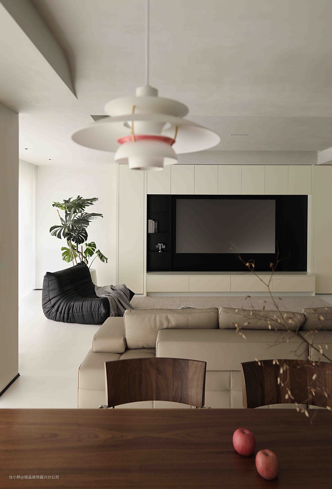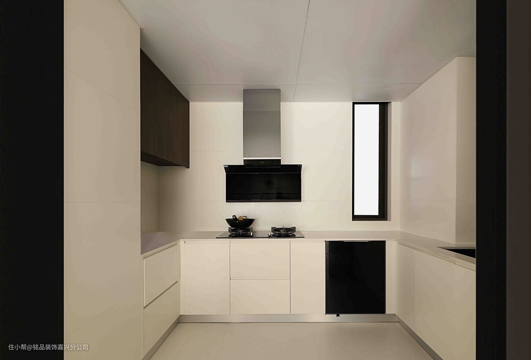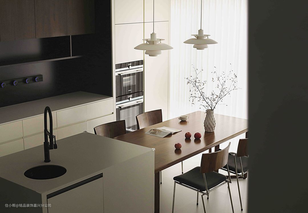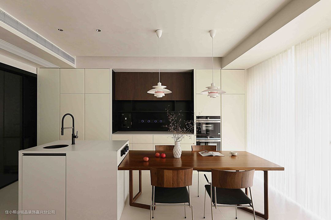 厨房做了U型布局,纯白色的下柜和木色吊柜结合,简约不单调。柜门均做免拉手设计,外观上极简干净又很高级。吊顶选了大板尺寸,视觉上也更显极简。黑色系的厨房电器嵌入,舒适自然有层次感。