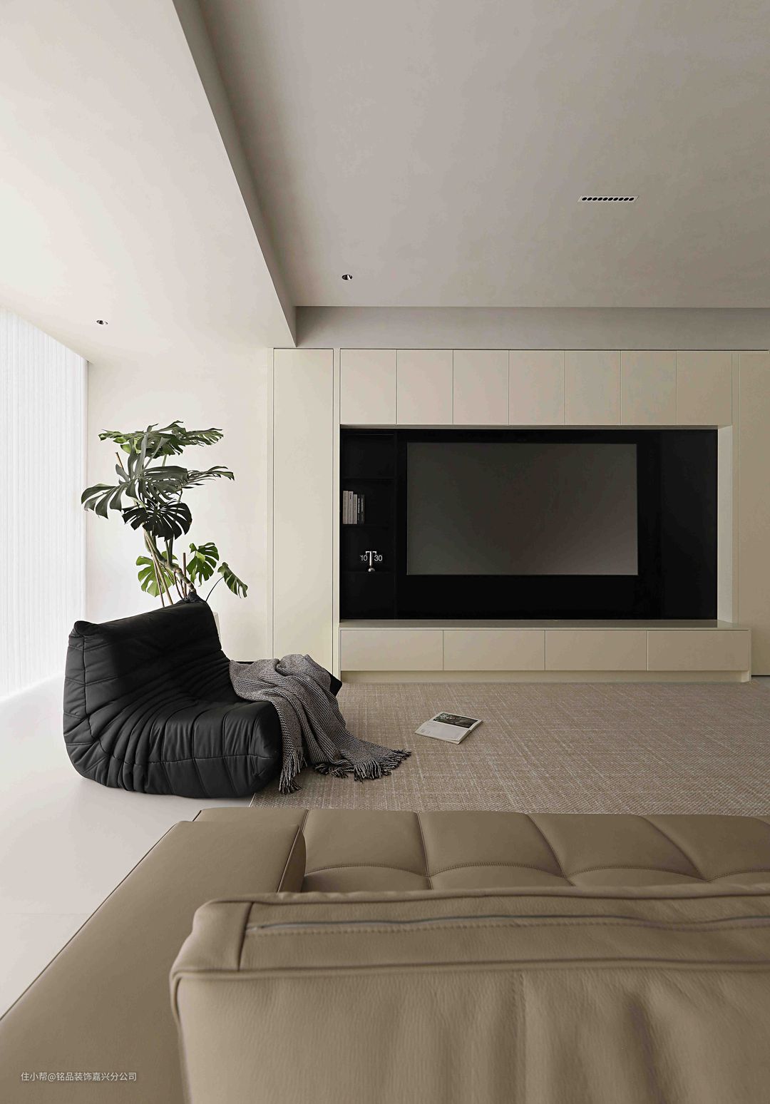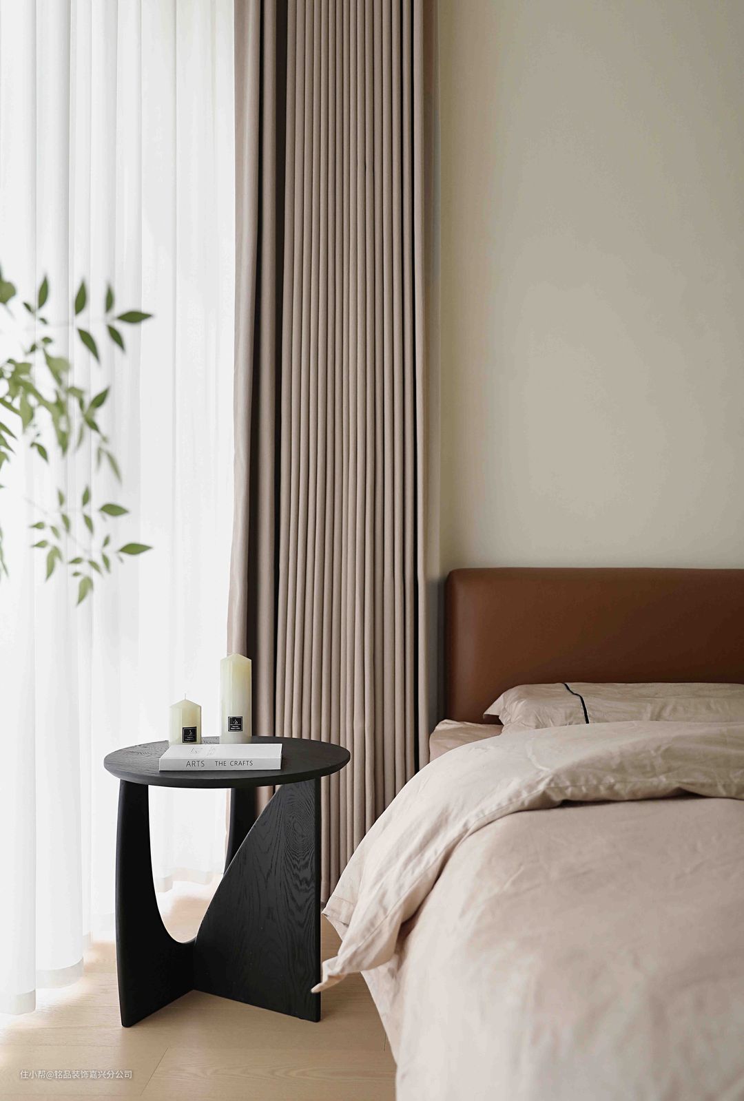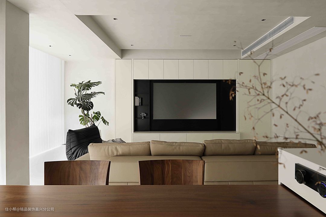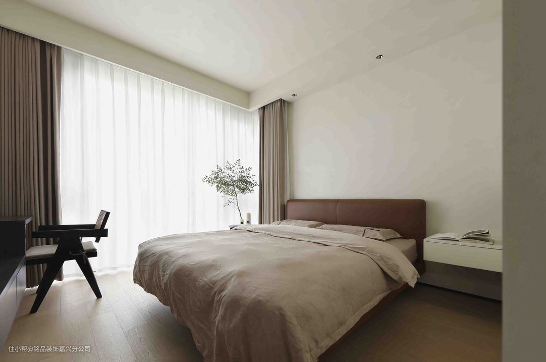 主卧遵循简约原则,背景墙仅用艺术漆处理,实木地板温和质朴,营造宁静轻柔的睡眠环境。一张小巧的黑胡桃边几立在一侧,放手机、杂志、摆件用。 床尾做了床头柜衔接书桌一体,增加居家办公和观影的功能。 独立衣帽间位于卧室旁,极窄黑框和踢脚线与艺术漆形成强烈对比,高级感油然而生。同色系定制柜清爽简约,达到隐形效果。
