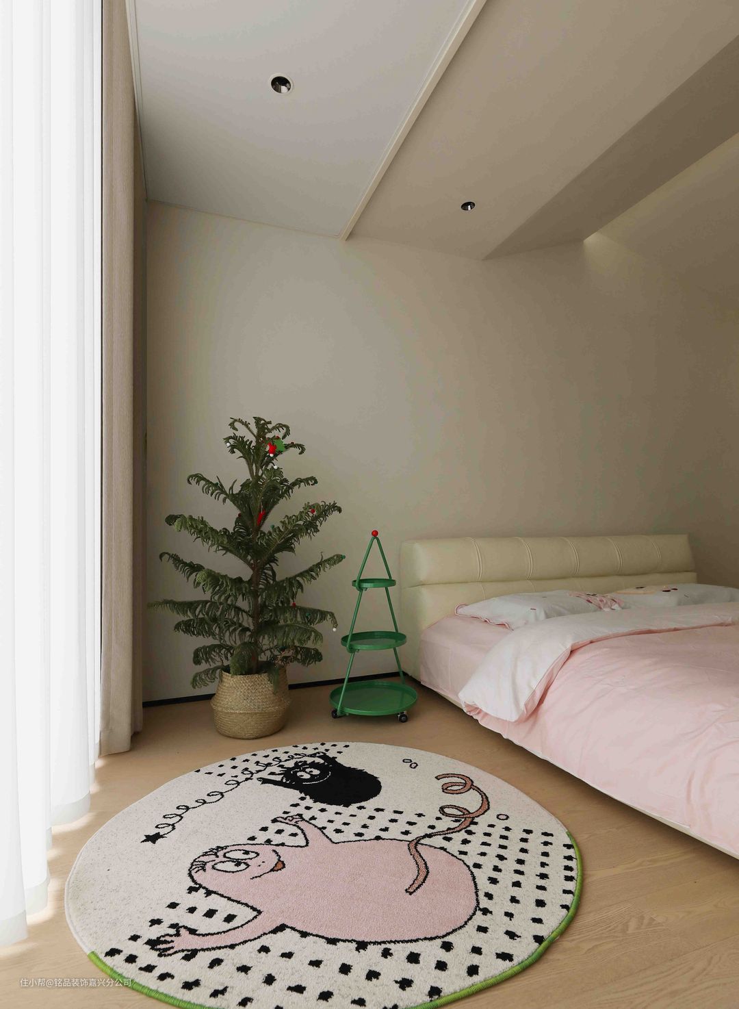 次卧是女儿房,硬装上比较简约,墙面统一的艺术漆,地面统一的木地板,顶面也是无主灯设计。吊顶做了别出心裁的设计,是一个不规则感+不同高度的叠搭,搭配上筒灯和灯带,更有趣味性。