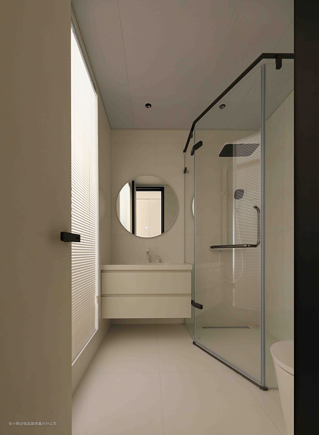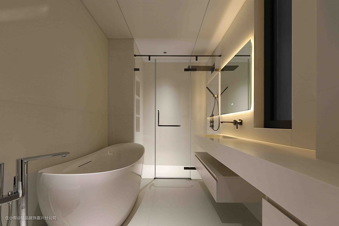 浴室以奶油色为主调,在五金和花洒等产品用银色点缀,很耐看又很有质感。奶油白的浴室柜,岩板一体盆好打理,搭配镜柜可以收纳很多瓶瓶罐罐。