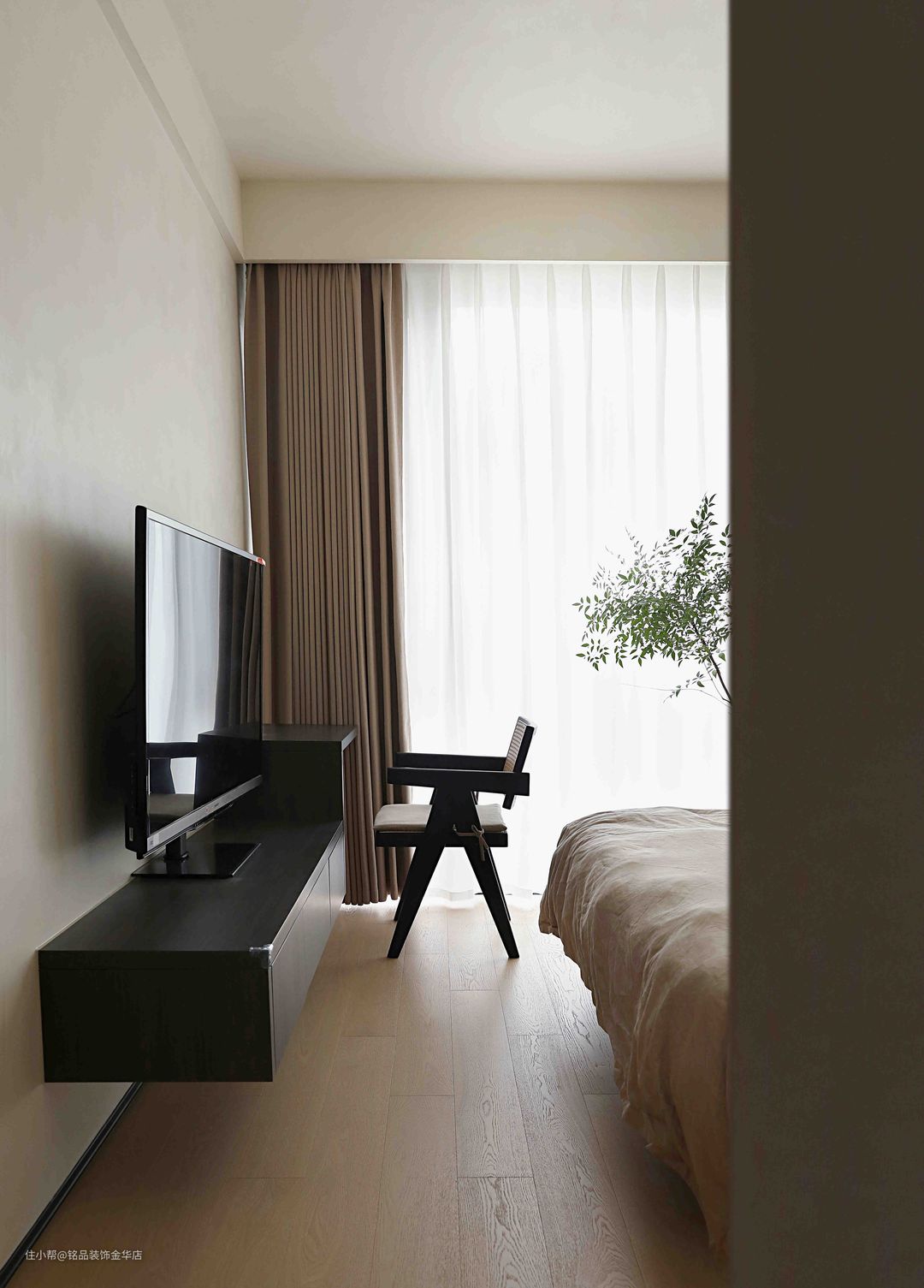 主卧遵循简约原则,背景墙仅用艺术漆处理,实木地板温和质朴,营造宁静轻柔的睡眠环境。一张小巧的黑胡桃边几立在一侧,放手机、杂志、摆件用。 床尾做了床头柜衔接书桌一体,增加居家办公和观影的功能。 独立衣帽间位于卧室旁,极窄黑框和踢脚线与艺术漆形成强烈对比,高级感油然而生。同色系定制柜清爽简约,达到隐形效果。