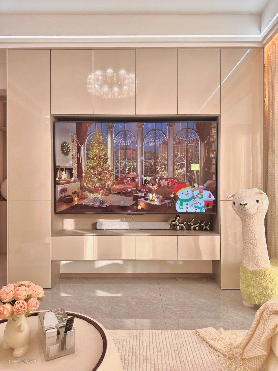 亮面浅灰色瓷砖通铺,最大限度打通客厅与阳台,视觉上更加宽敞 明亮 客厅菱花白乳胶漆 通刷墙面 简单的设计方便后期的生活 四周边吊 做灯槽 视觉上让空间更有层次感 不压层高 米白色高光板材电视柜 ,在灯光和整体色调的衬托下 更加温馨柔和