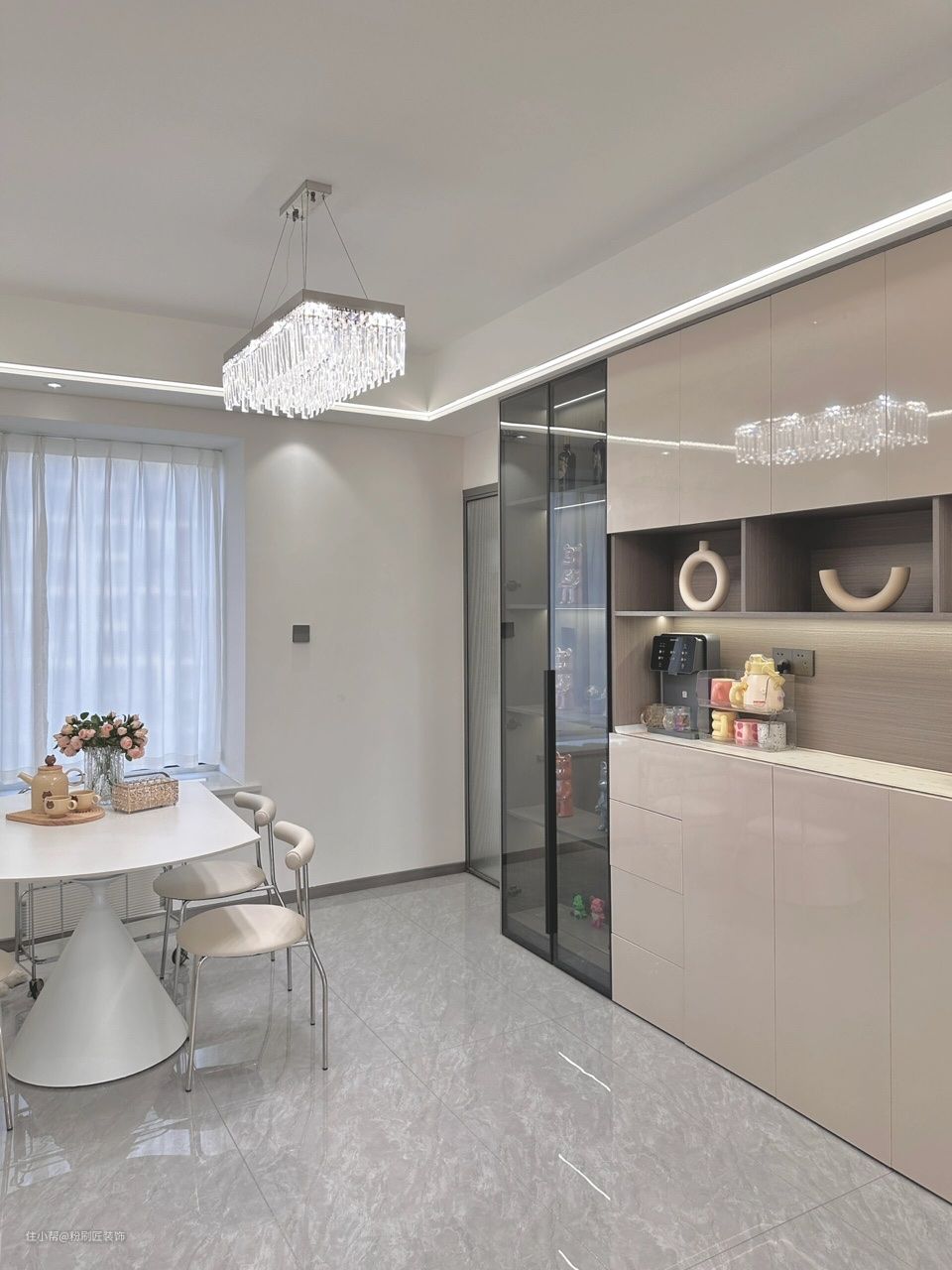 与客厅统一 边吊吊顶嵌入灯带 餐边柜中空预留45-50公分 放置直饮机 左侧玻璃柜门柜体嵌入灯带 作为展示柜灯光 600*1200的造型餐桌 搭配四把白色餐椅 简约大气