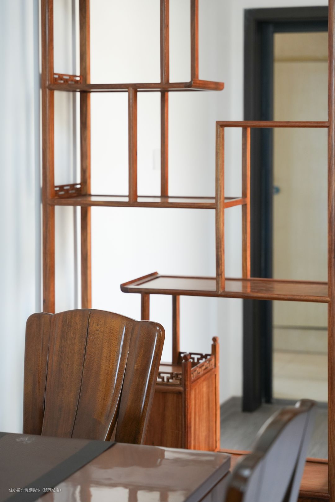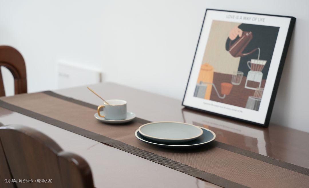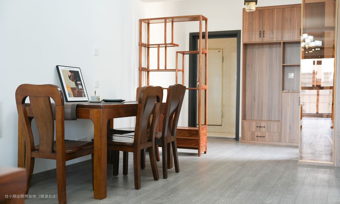 餐桌的选择与置物架颜色相同,显得沉稳不张扬,置物架的摆放也对餐厅进行了一定的遮挡。