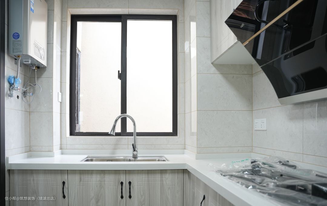 U型厨房让活动范围增加的同时,更符合洗切炒的烹饪顺序,各分区互不干扰。浅色系的搭配也让厨房看起来干净整洁。