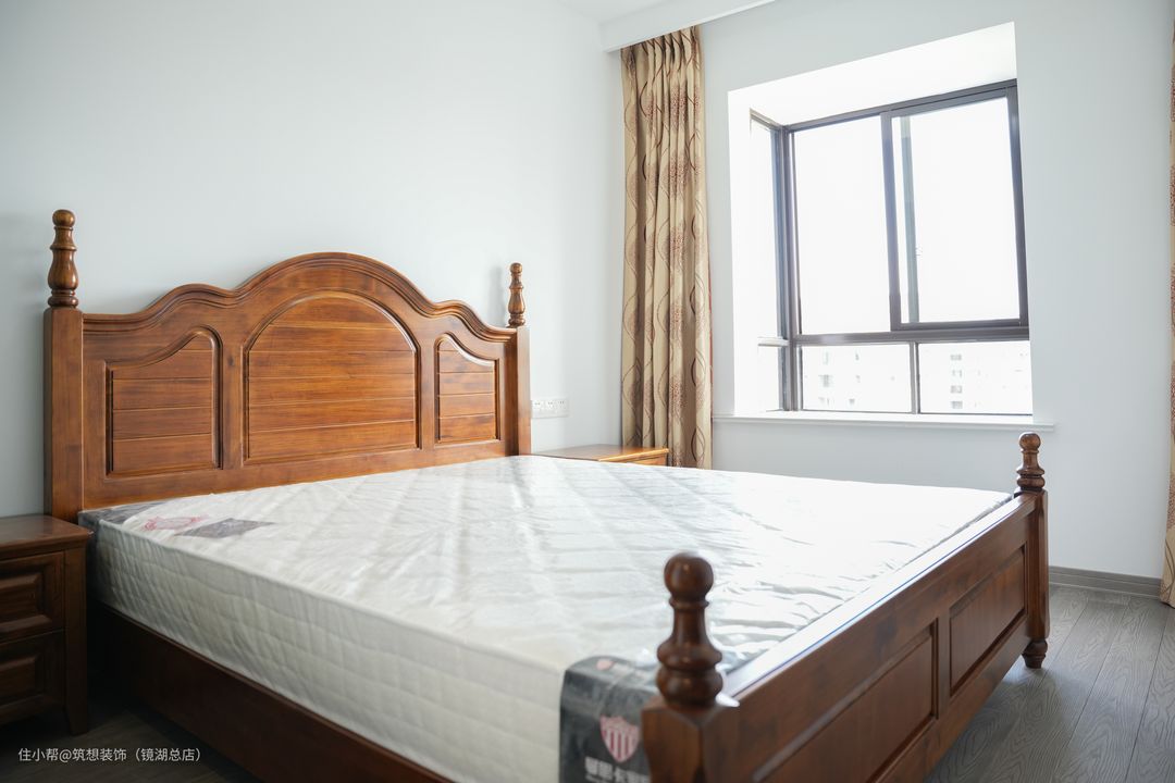 主卧的大床还是选择深色系的纯木样式,与其他空间相呼应,柔和的光线透过飘窗,让卧室更显温馨舒适。