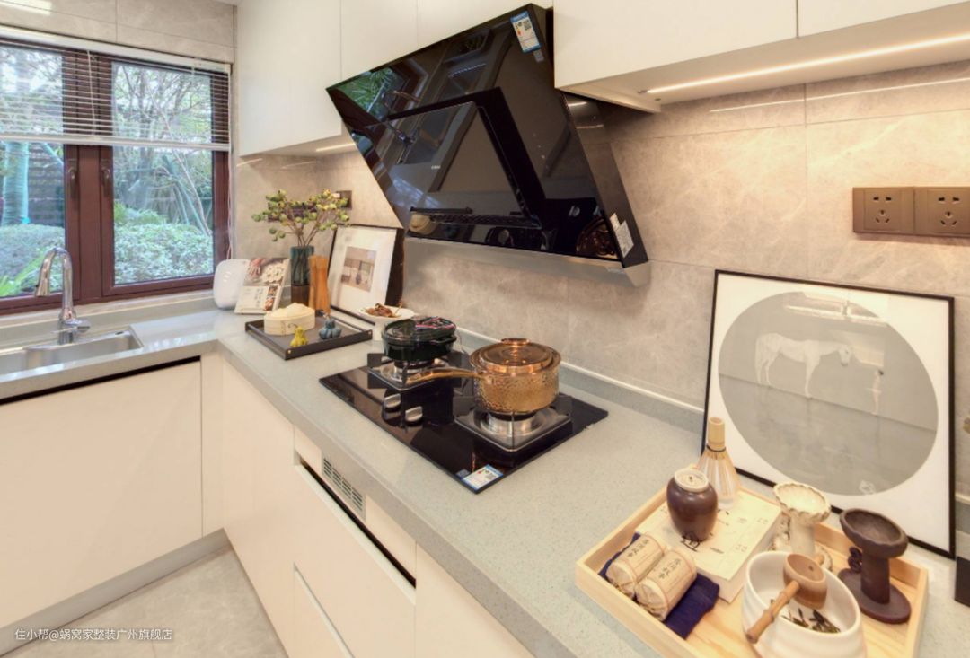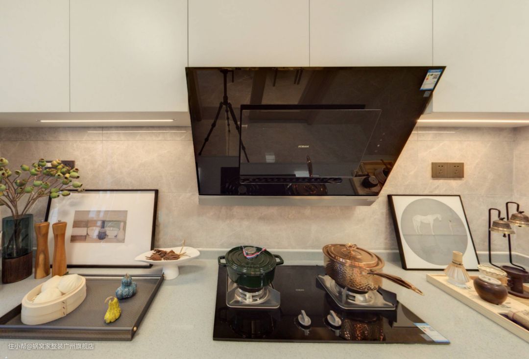 在这个精心设计的厨房中,每一处细节都体现了功能与美观的完美结合。灶台巧妙地内嵌于台面之中,不仅增强了整体的空间感,还使得烹饪过程更加便捷高效。更难能可贵的是,油烟机管道被巧妙地隐藏起来,既保证了厨房的整洁美观,又避免了油烟四溢的困扰。这样的设计,不仅提升了厨房的使用体验,更彰显了主人对品质生活的追求和品味。