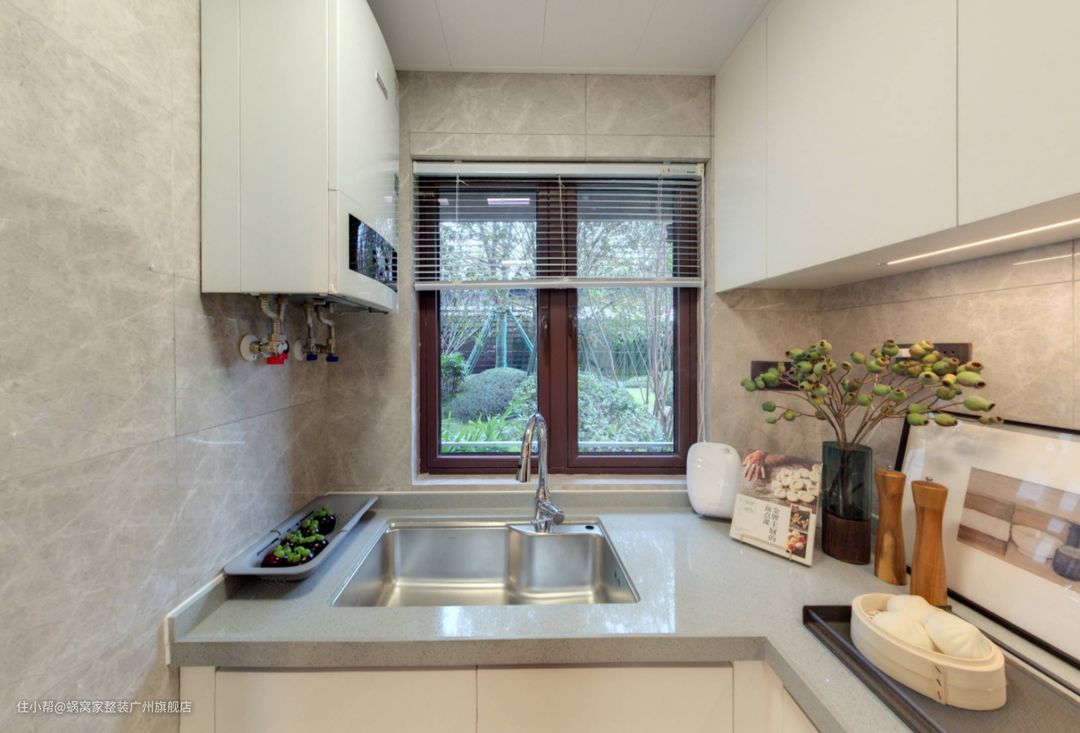 厨房内部布局呈L型,这种设计不仅充分利用了空间,还使得动线更加合理。无论是准备食材、烹饪还是清洗餐具,都能在这个L型动线中轻松完成,大大提高了烹饪效率。同时,厨房的采光也十分出色,大面积的窗户让自然光线充分洒入,营造出温馨舒适的烹饪环境。