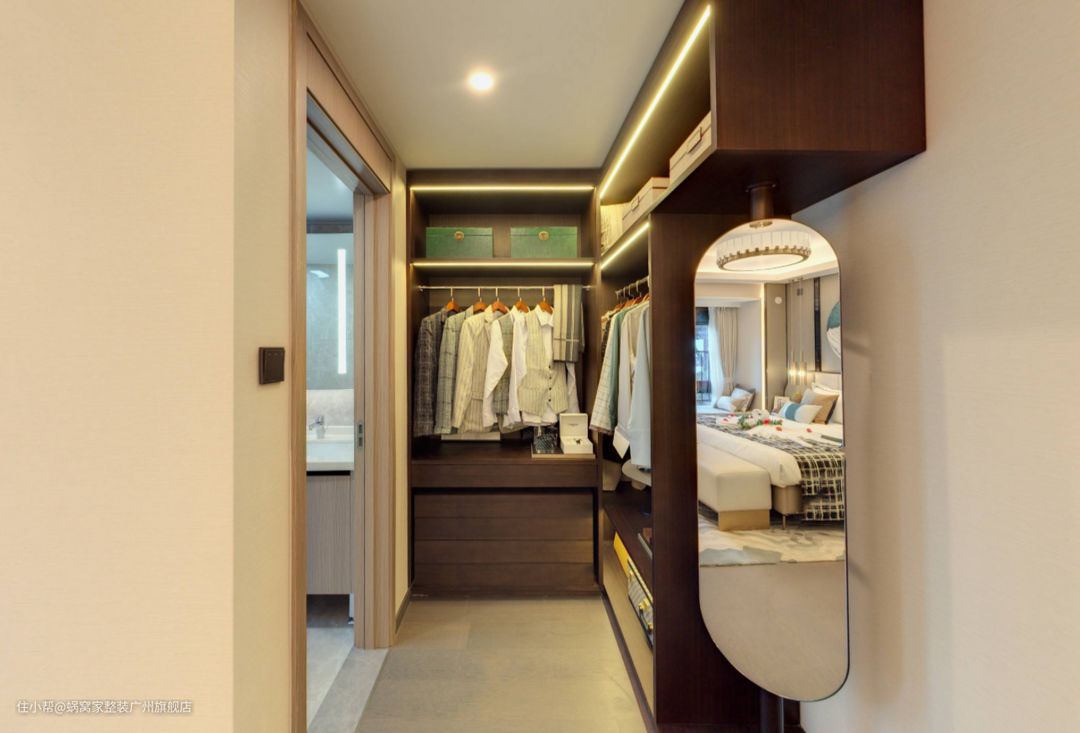 在这个优雅而精致的主卧设计中,步入式衣帽柜作为主卫的门户,不仅为居住者提供了充足的储物空间,还巧妙地成为了连接两个空间的桥梁。衣帽柜的设计充满了实用性与美学考虑,它的每一块板材、每一个抽屉都经过精心策划,以满足主人对于收纳与展示的需求。尤为引人注目的是,衣帽柜的一面全身镜,它不仅仅是一个简单的装饰元素,更是空间的魔法师。这面镜子不仅可以帮助居住者整理仪表,还可以将光线与视线引入主卧的内部,让空间显得更为宽敞明亮。更有趣的是,当光线从镜子中反射出来,它可以温柔地触及主卧的床铺,仿佛在夜晚为主人描绘出一幅宁静而温馨的画面。